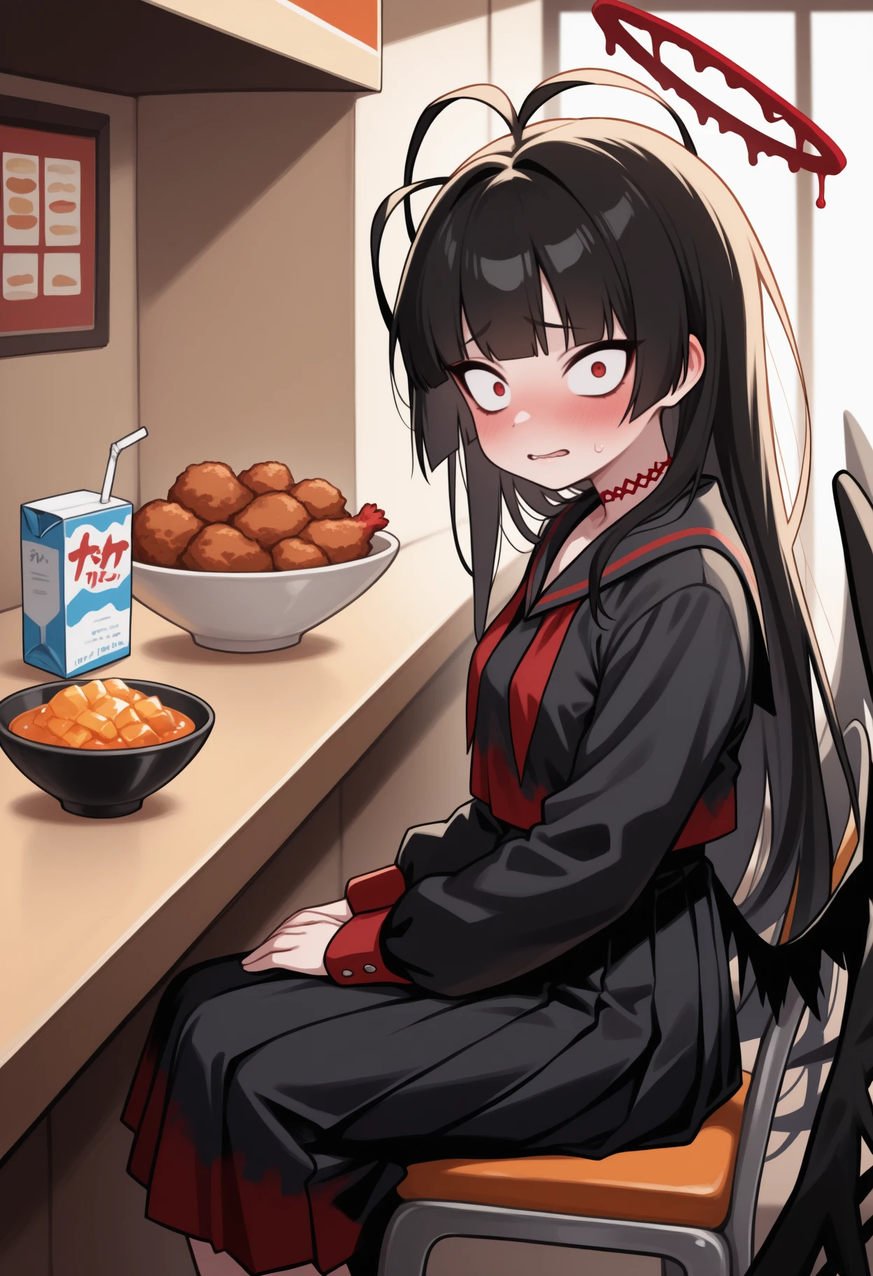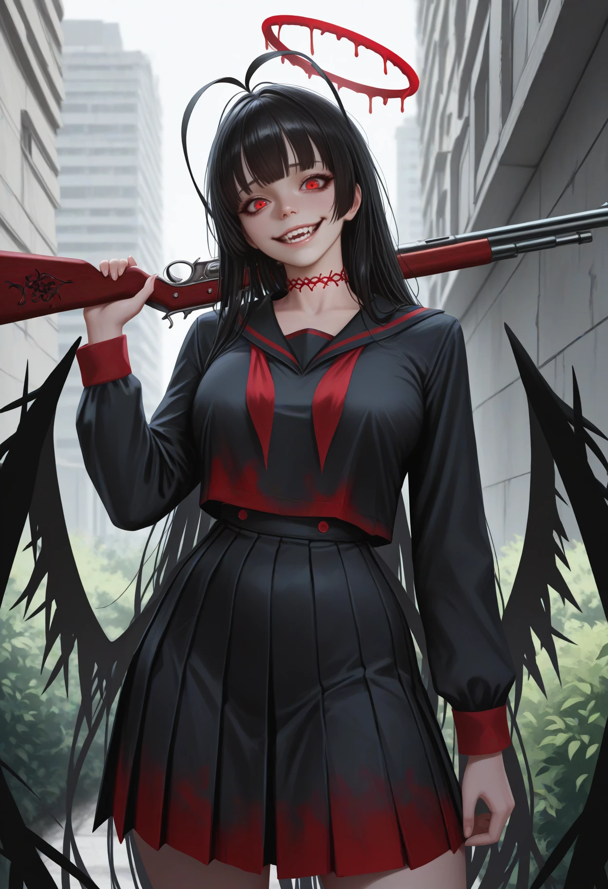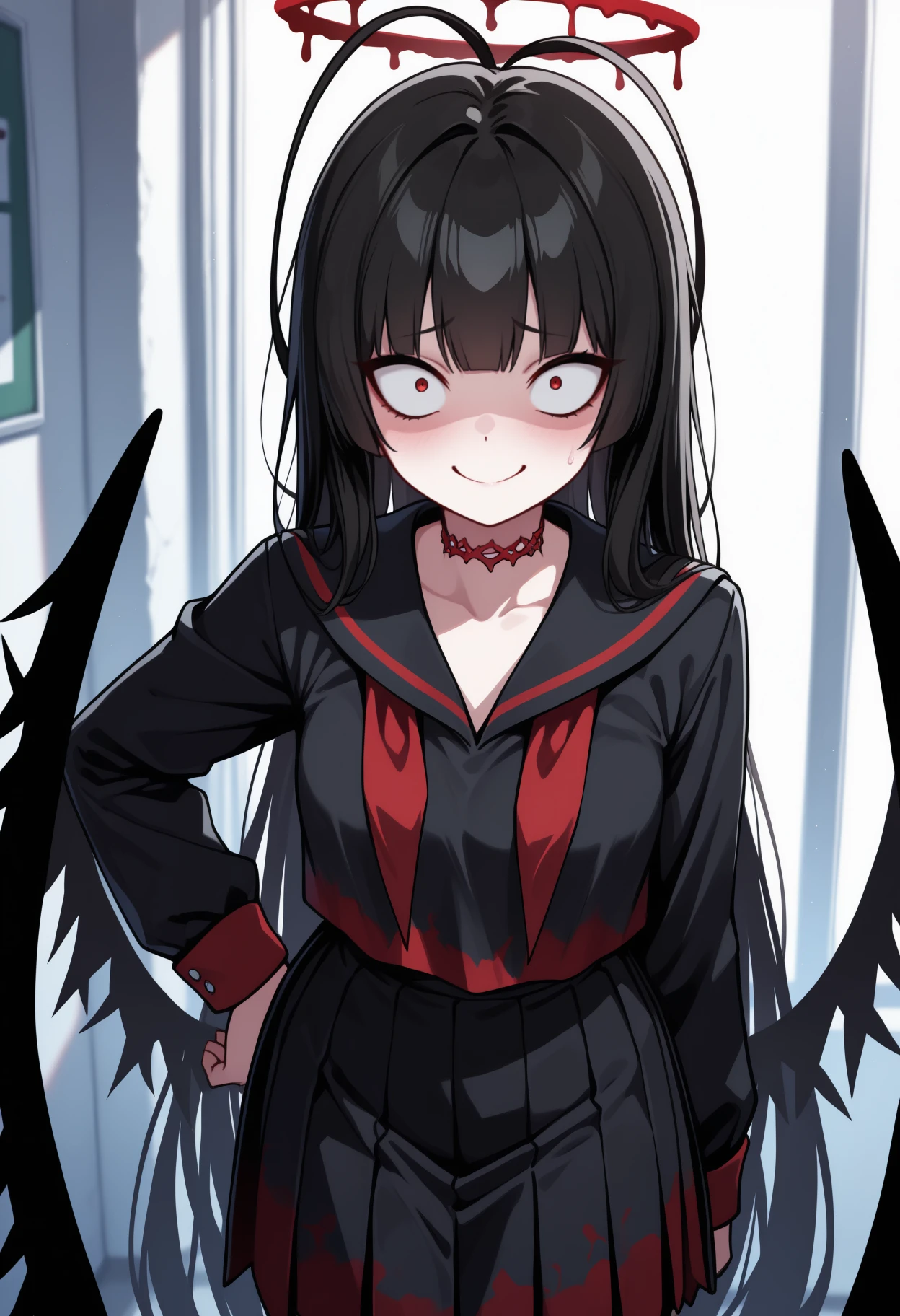 tsrgdef, black wings, long hair, black hair, antenna hair, red halo, red eyes, school uniform, black serafuku, black shirt, black sailor collar, red neckerchief, long sleeves, long skirt, black skirt, pleated skirt, red choker