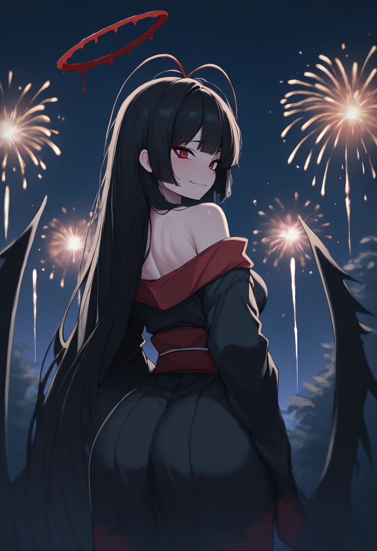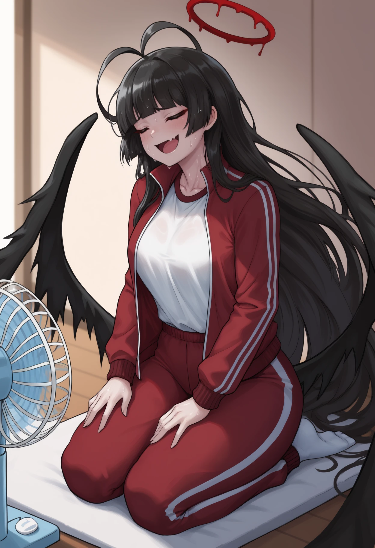 Default Outfit: tsrgdef, black wings, long hair, black hair, antenna hair, red halo, red eyes, school uniform, black serafuku, black shirt, black sailor collar, red neckerchief, long sleeves, long skirt, black skirt, pleated skirt, red choker