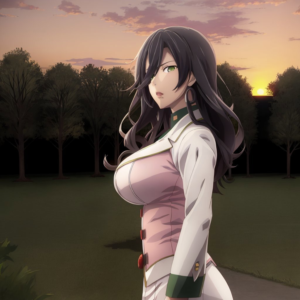 Use "black hair" "green eyes" "large breasts" if you're struggling to get her to appear properly or just refer to the metadata for more tags.