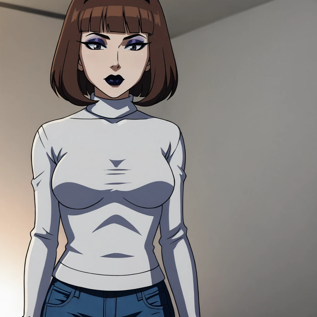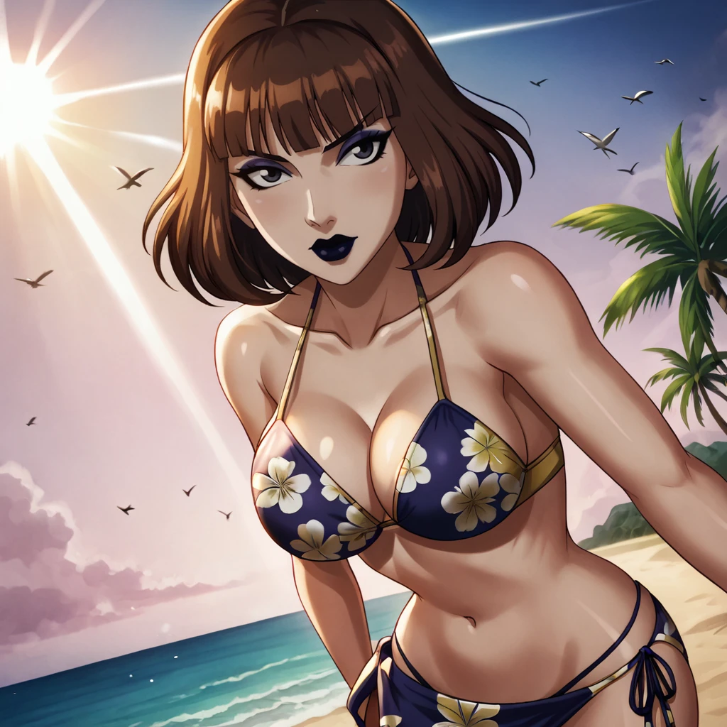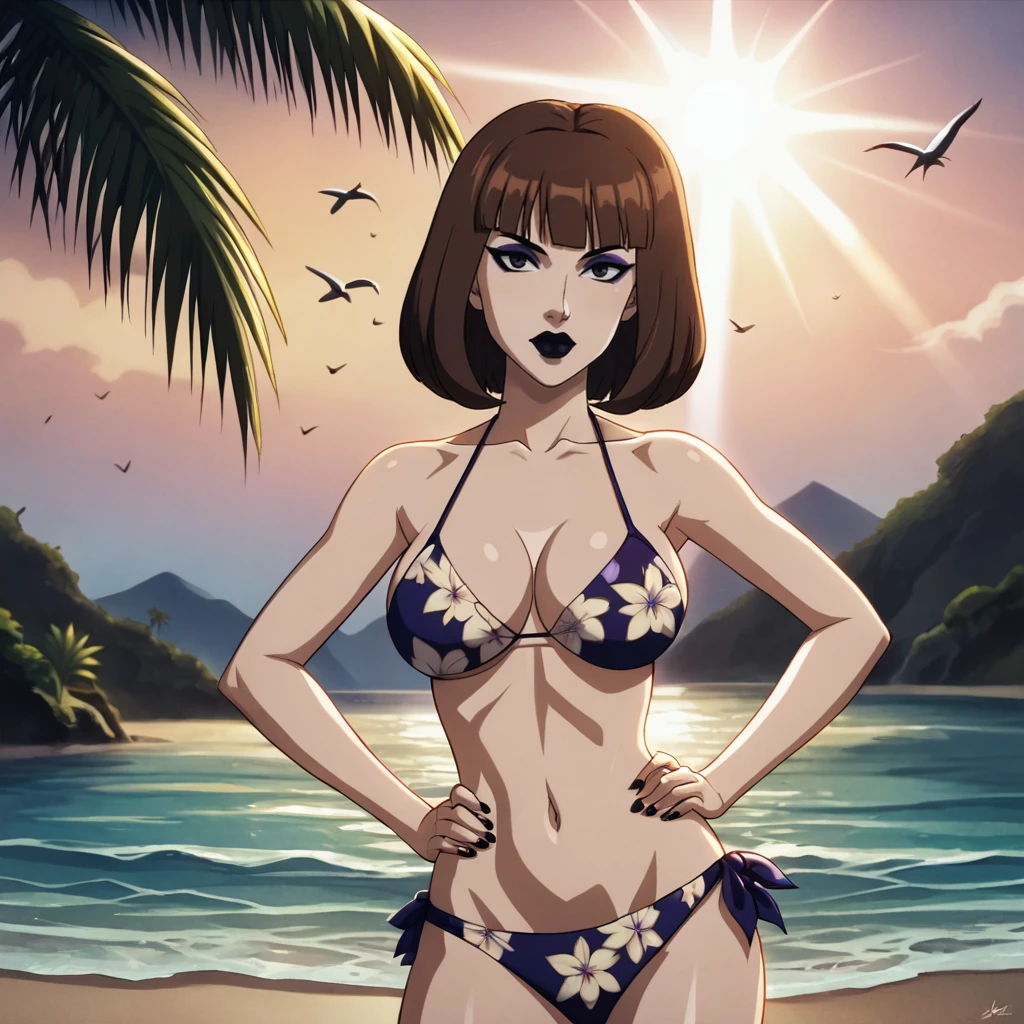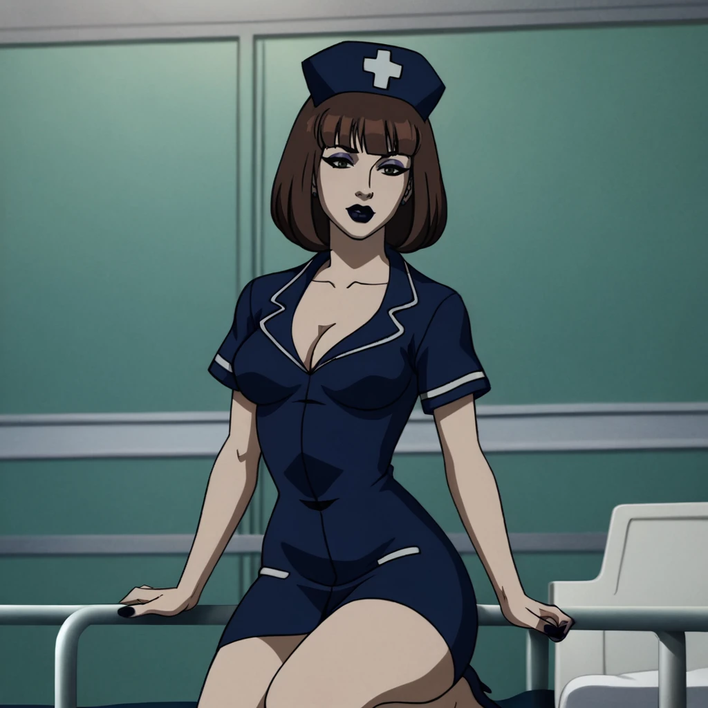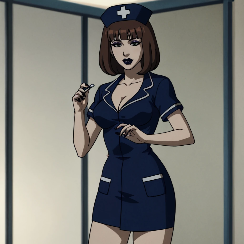 Trigger with hospital clothes: asathehealerhospital, 1girl, medium breasts, cleavage, hat, brown hair, black lips, nurse cap, dress, makeup, lipstick, short hair, bob cut, nail polish