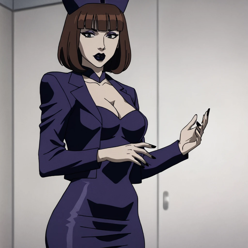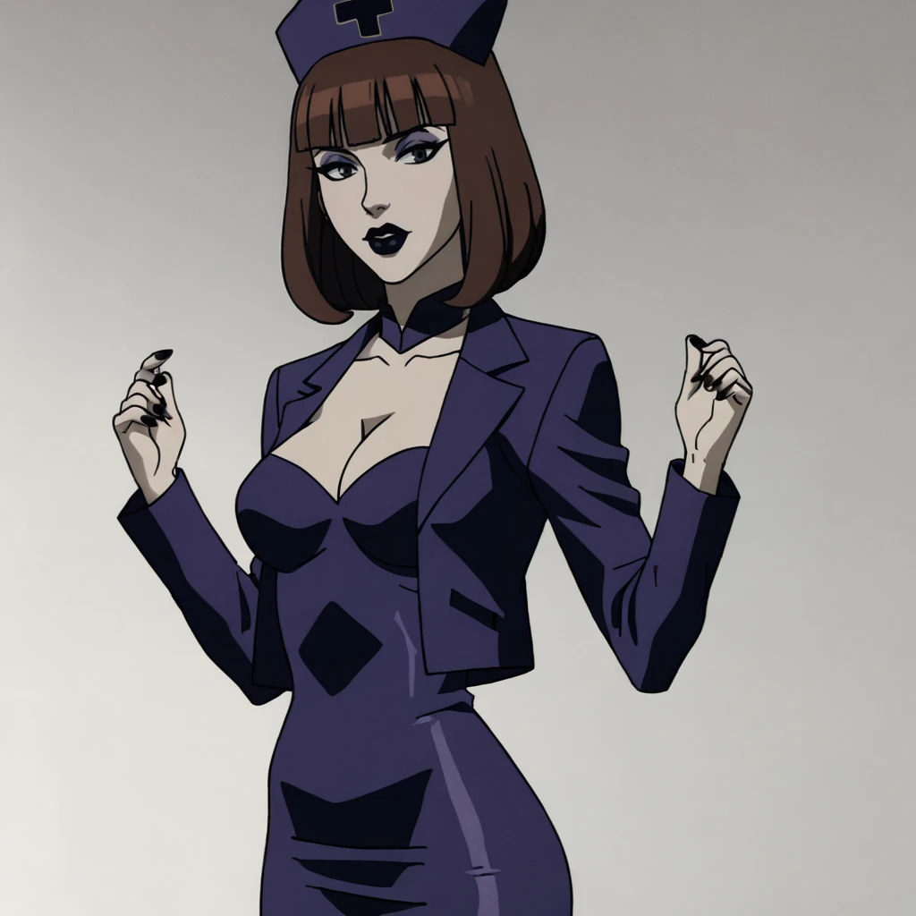 Trigger with jacket: asathehealercoat, 1girl, medium breasts, cleavage, hat, brown hair, lipstick, makeup, black lips, dress, nurse cap, short hair, bob cut, blunt bangs, jacket, nail polish, choker, cross, black nails