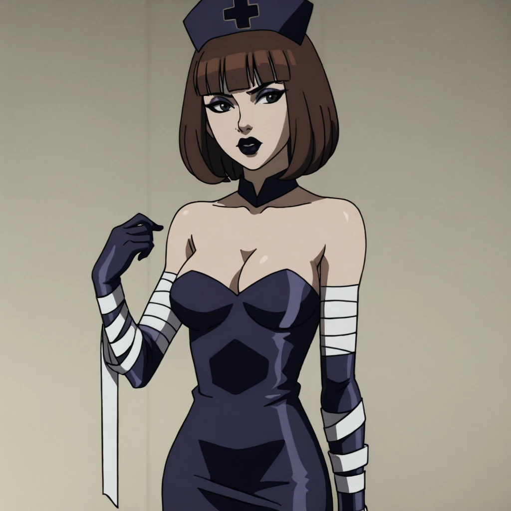 Trigger : asathehealer, 1girl, makeup, medium breasts, bandages, cleavage, hat, lipstick, black lips, nurse cap, black gloves, elbow gloves, short hair, bob cut, brown hair, choker, strapless dress, blunt bangs, bare shoulders, bandaged neck, eyeshadow, cowboy shot