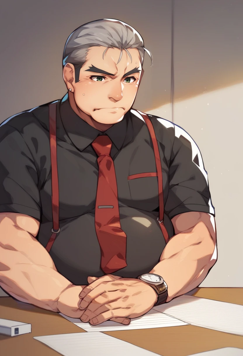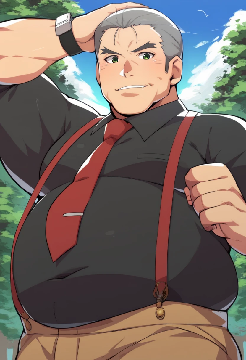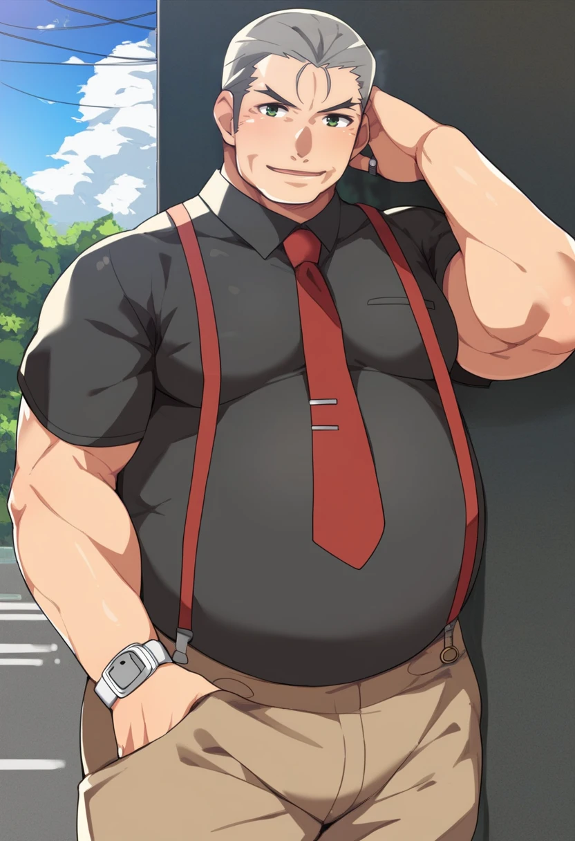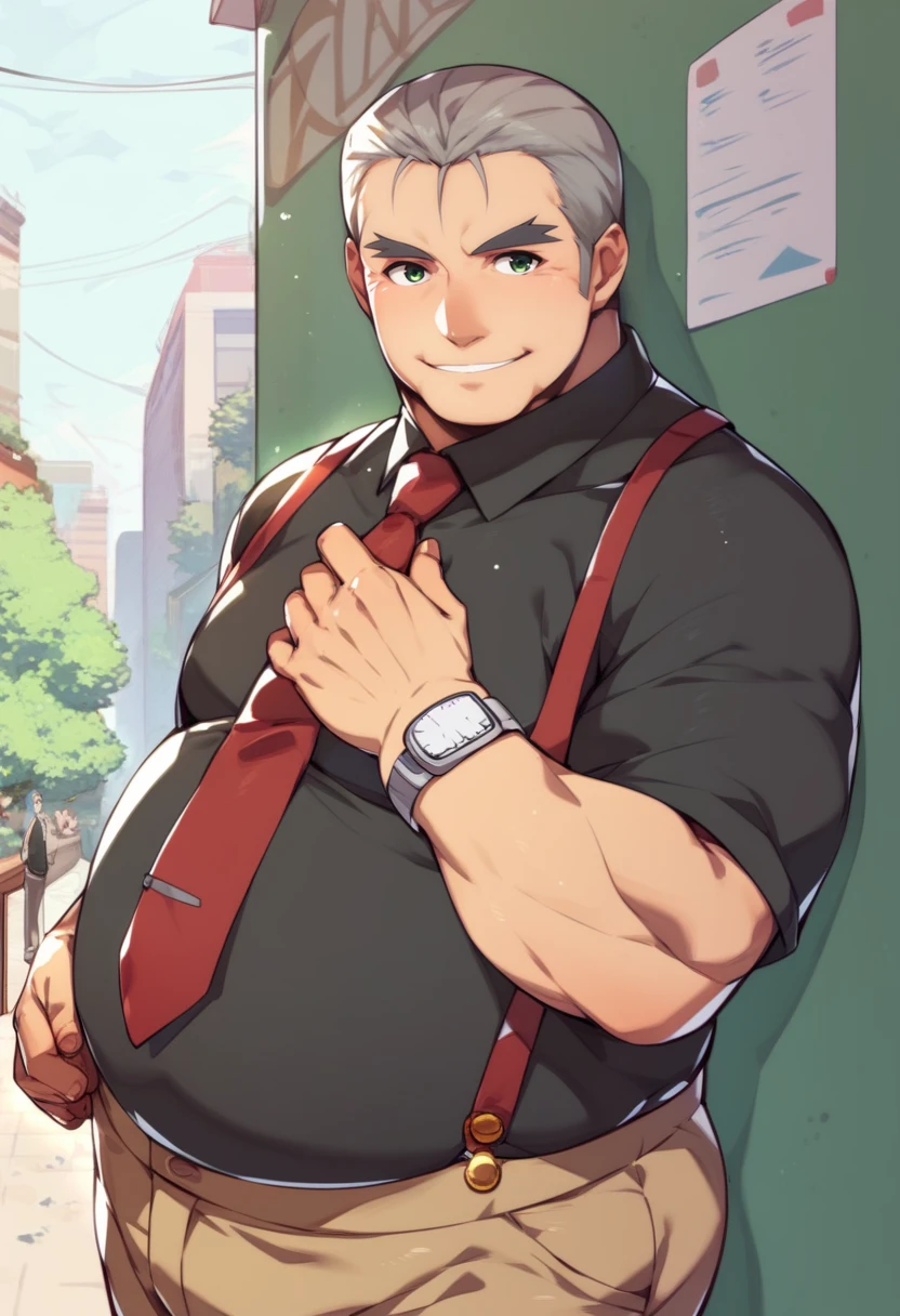 old man, fat man, short hair, grey hair, hair slicked back, green eyes, black shirt, (brown pants:0.9), red necktie, suspenders, wristwatch,
