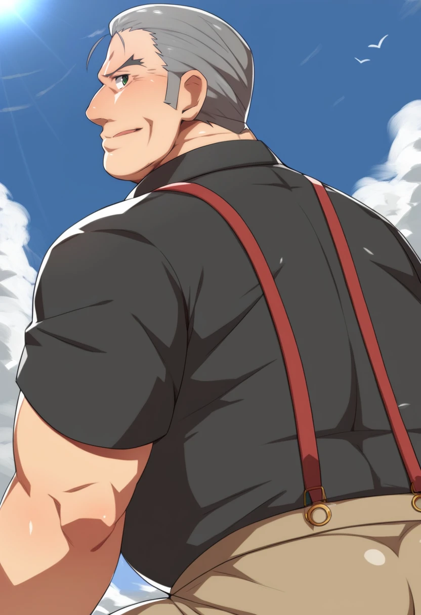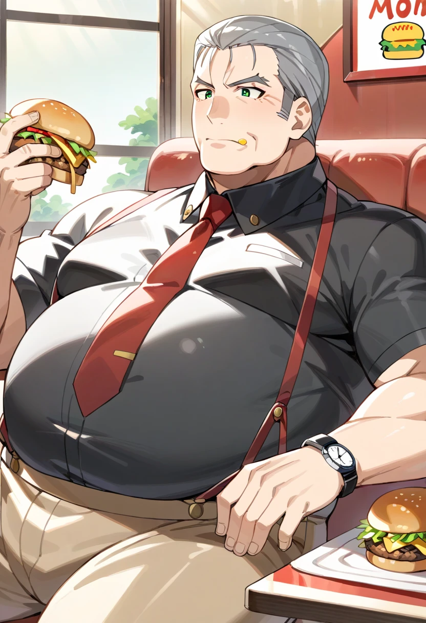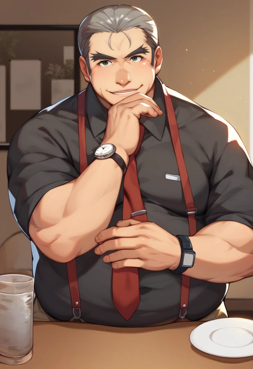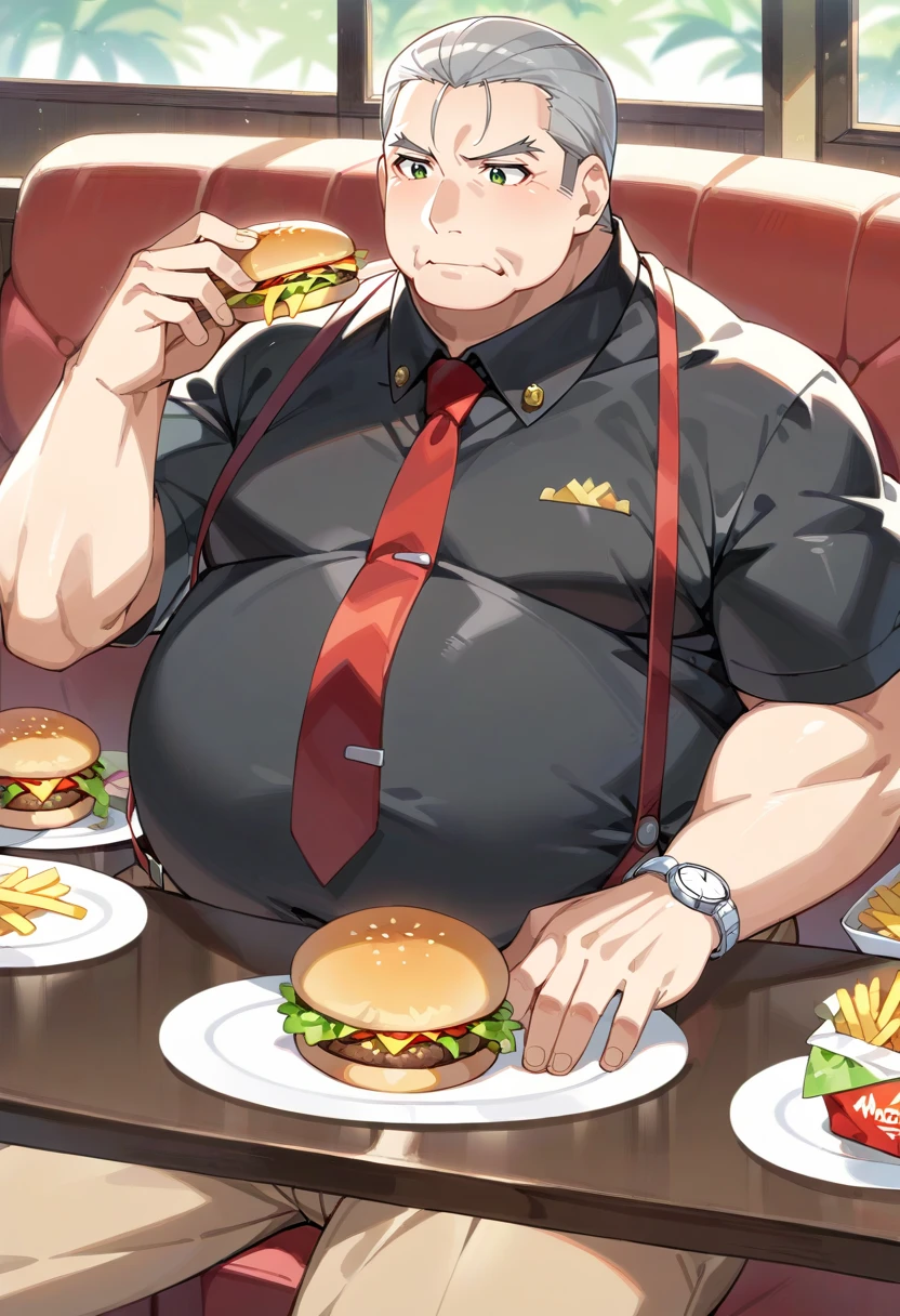 old man, fat man, short hair, grey hair, hair slicked back, green eyes, black shirt, (brown pants:0.9), red necktie, suspenders, wristwatch,