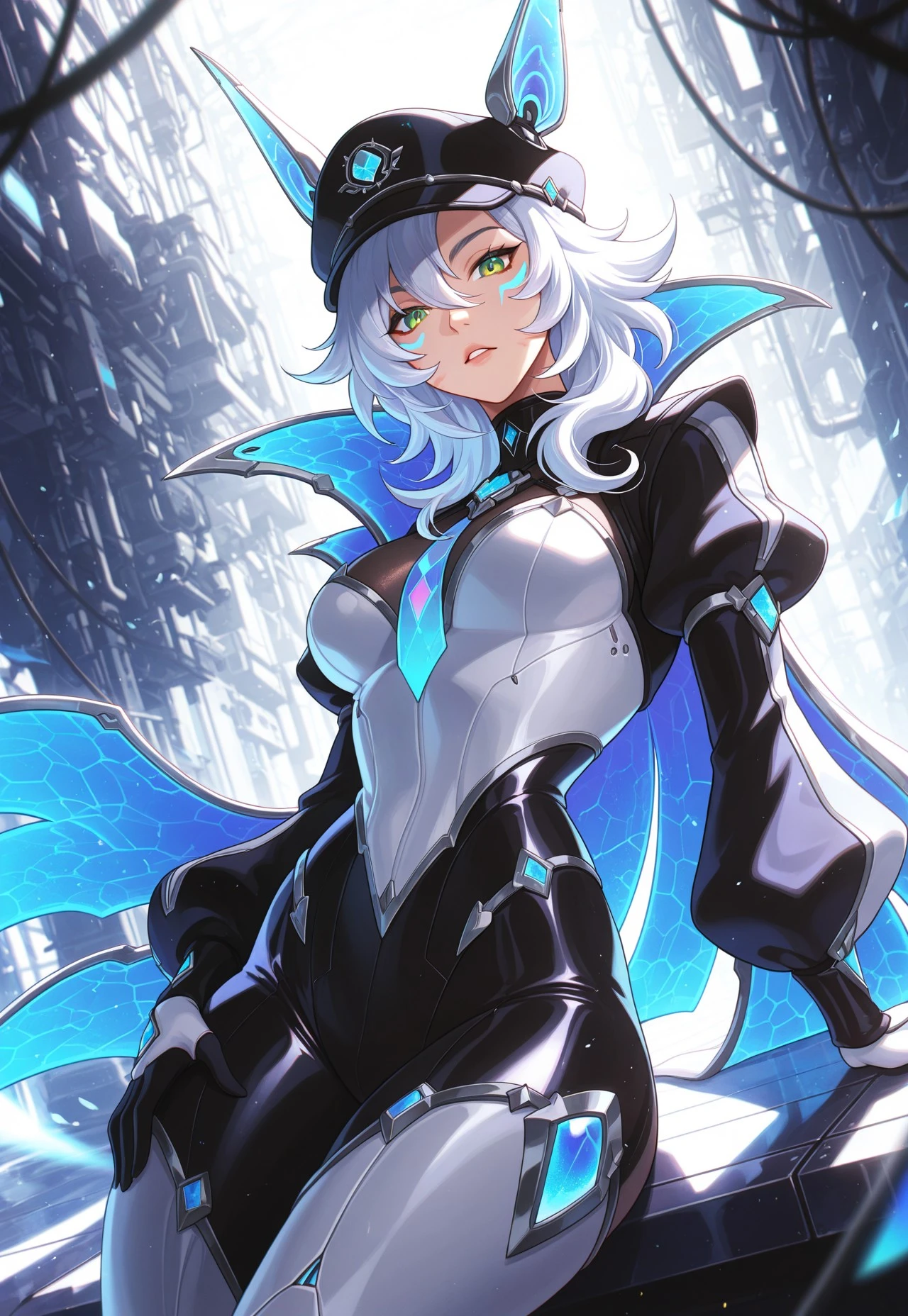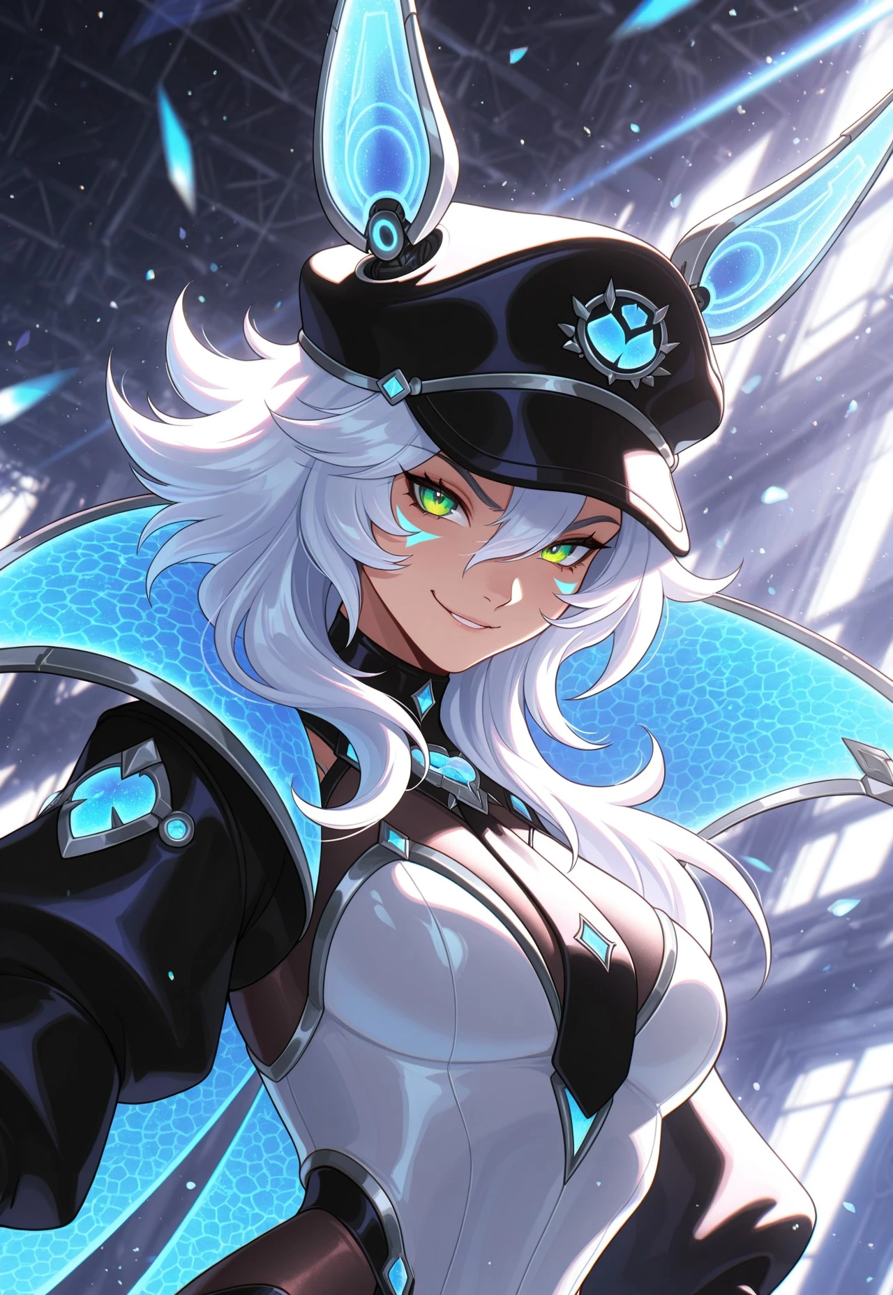 BBXayah, medium hair, white hair, baseball cap, mechanical ears, green eyes, face marks, tie, cloak, , puff sleeves, gloves,