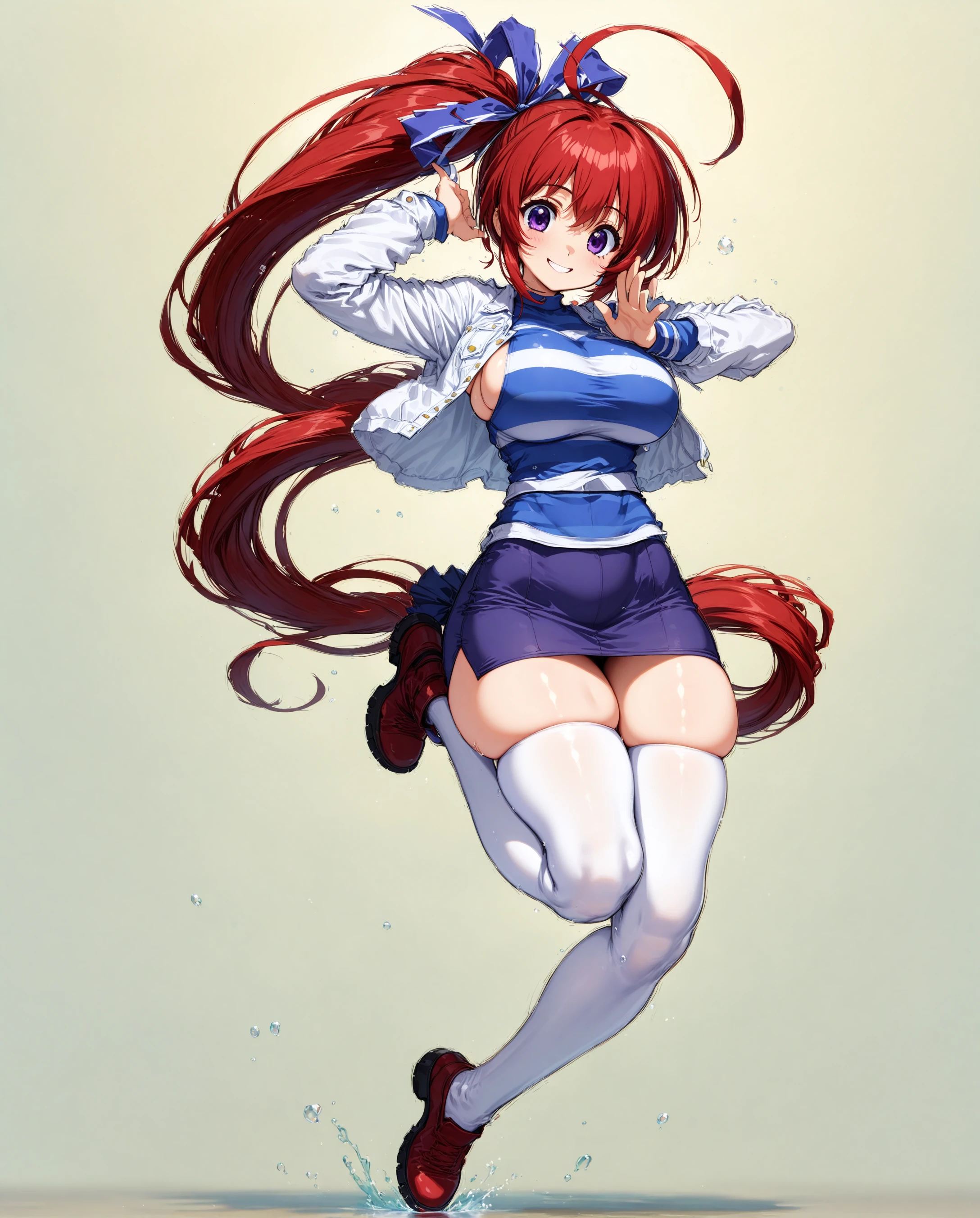 mizuki takase,mizuki_takase,comic_party,large_beautiful_eyes,white jacket, striped Tshrit,white high socks,red_hair, hair_ribbon,one_side_pony_tail,purple_eye, large breast,19 year old girl,white_high_ socks,zettai ryouiki, thighhighs, skindentation,ahoge,one pony tail,thick thighs,blue_skirt,sideboob, short skirt,very long hair,