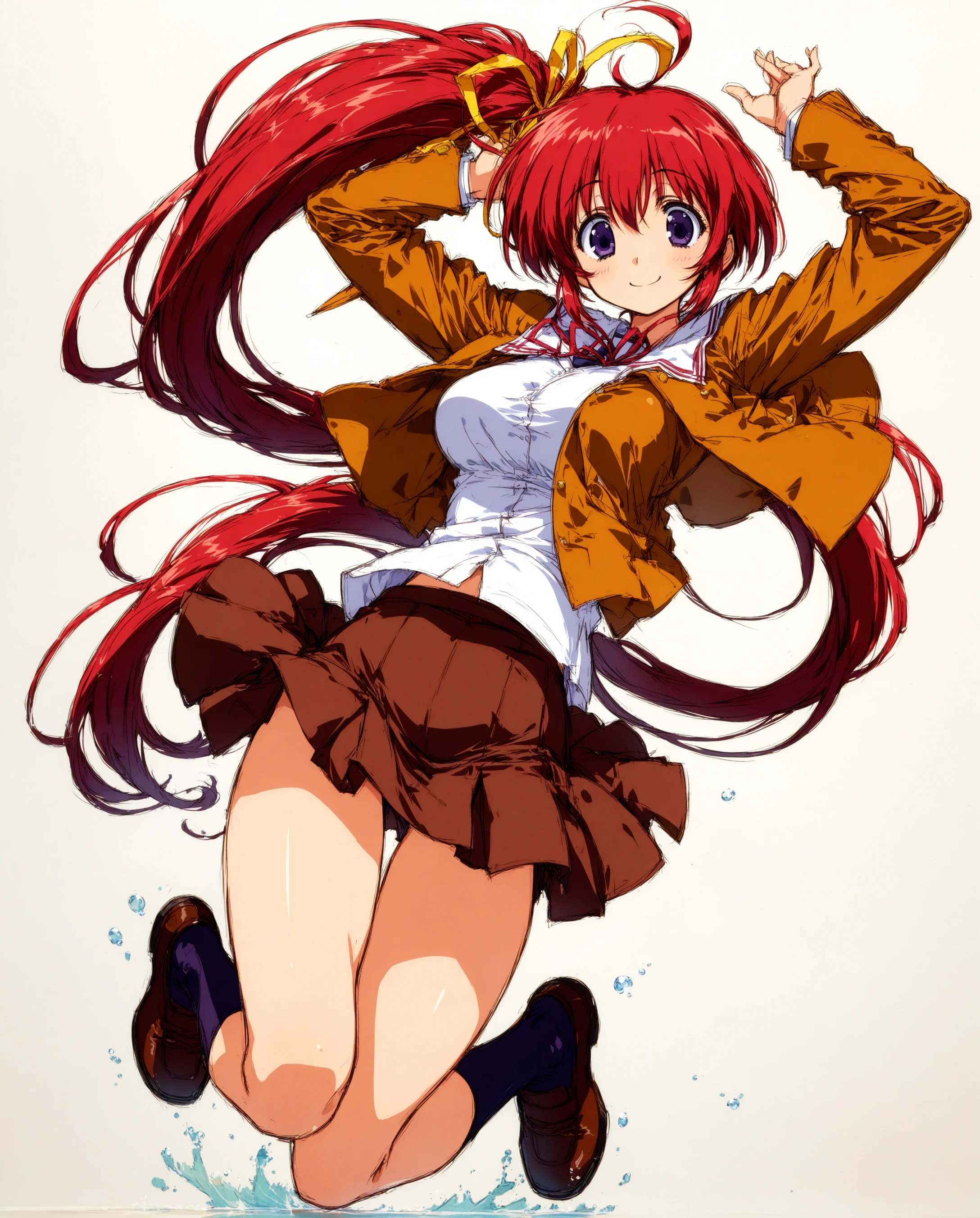 mizuki_takase,mizuki_takase,comic_party,,large_beautiful_eyes,red_hair, hair_ribbon,one_side_pony_tail,purple_eye, large breast,19 year old girl,high socks,zettai ryouiki, thighhighs, skindentation,ahoge,one pony tail,thick thighs,sideboob, very long hair, short skirt,