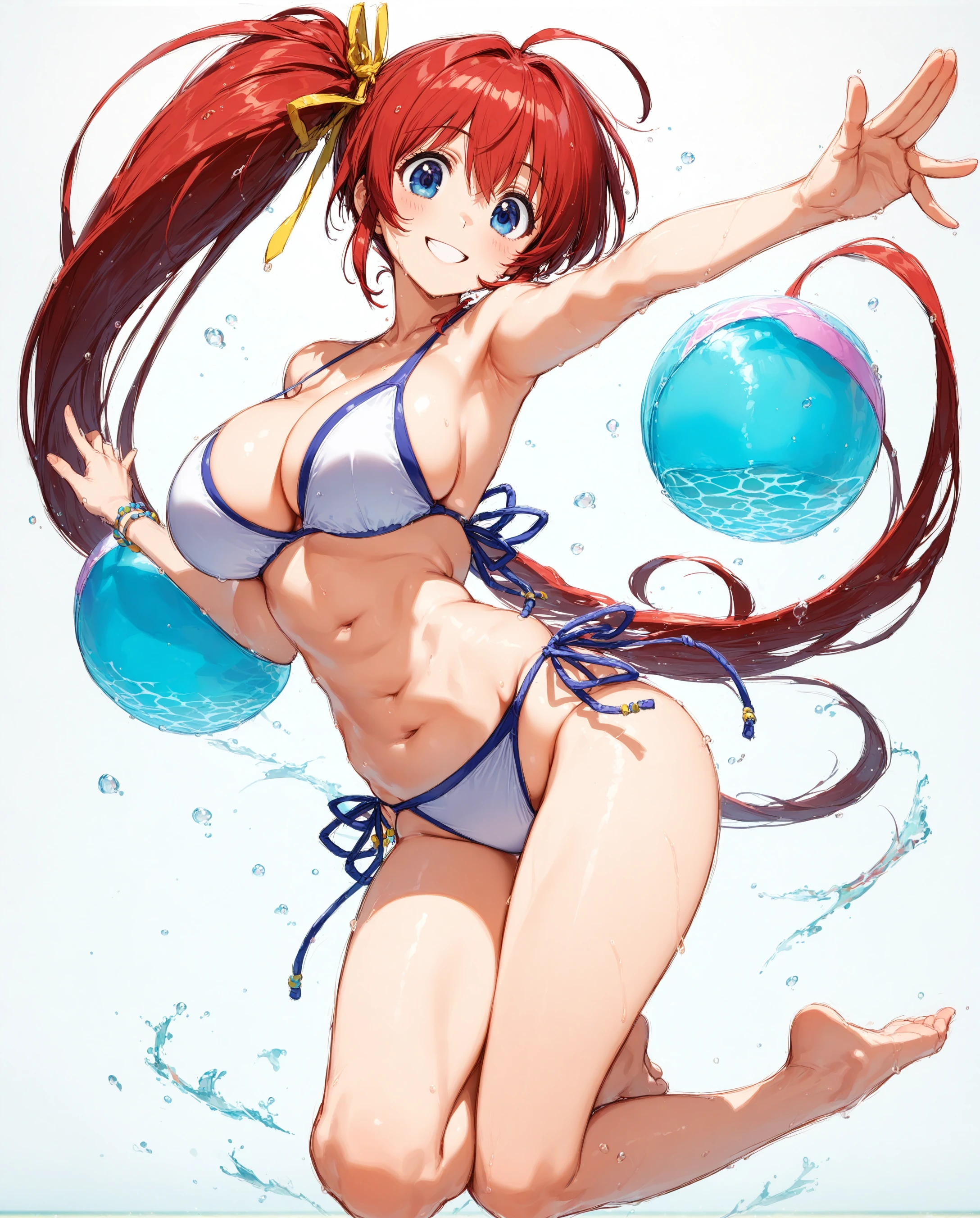 mizuki takase,mizuki_takase,comic_party,1girl, solo, swimsuit, bikini,,large_beautiful_eyes, side-tie bikini bottom, white bikini, breasts, side ponytail, cleavage,navel, large breasts,,sideboob, very long hair,