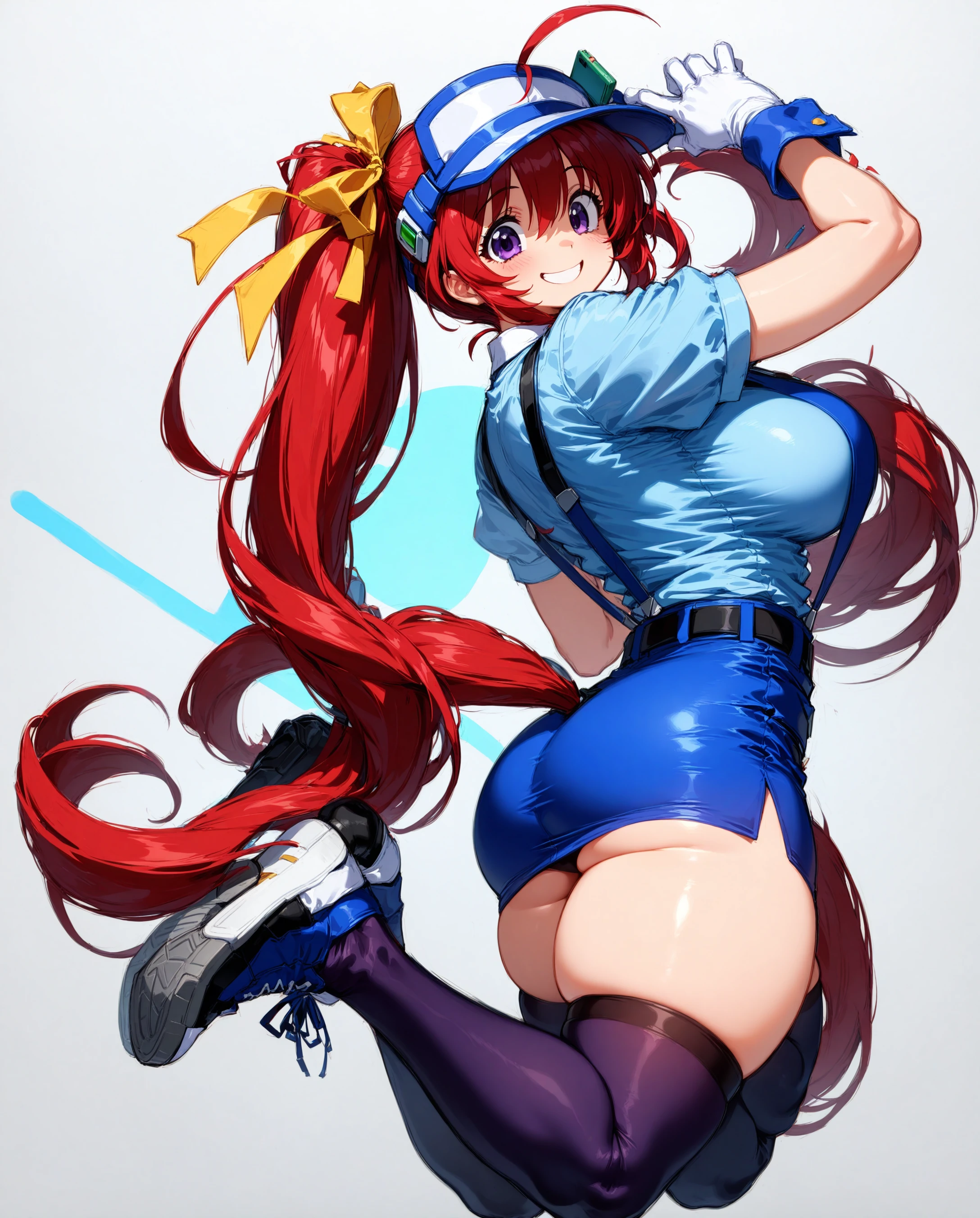 mizuki takase,mizuki_takase,comic_party,comic_party_uniform,suspenders,skirt,visor_cap,hat,head wear,red_hair, hair_ribbon,one_side_pony_tail,purple_eye, large breast,19 year old girl,socks,zettai ryouiki, thighhighs,ahoge,one pony tai,large_beautiful_eyes,l,thick thighs,shoes,blue_pencil_skirt,sideboob, short skirt,very long hair,