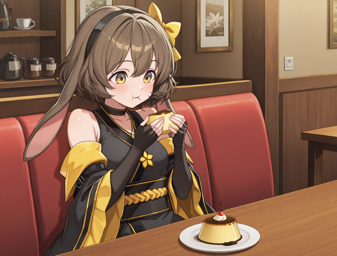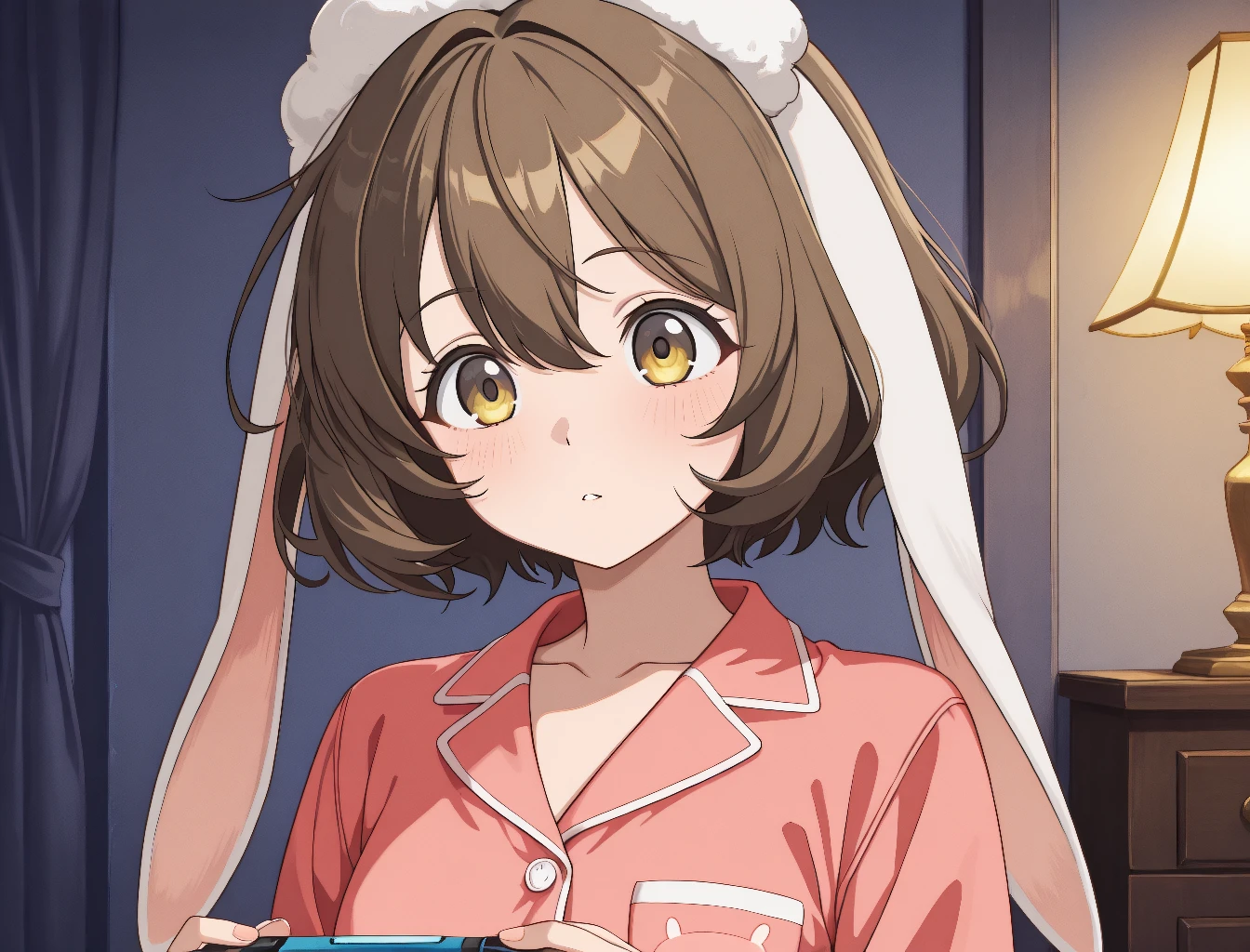 1girl, animal_ears, rabbit_ears, short_hair, medium_hair, brown_hair, brown_eyes, yellow_eyes, bangs, hair_between_eyes, small_breasts,