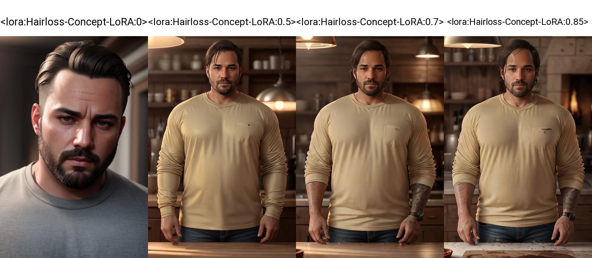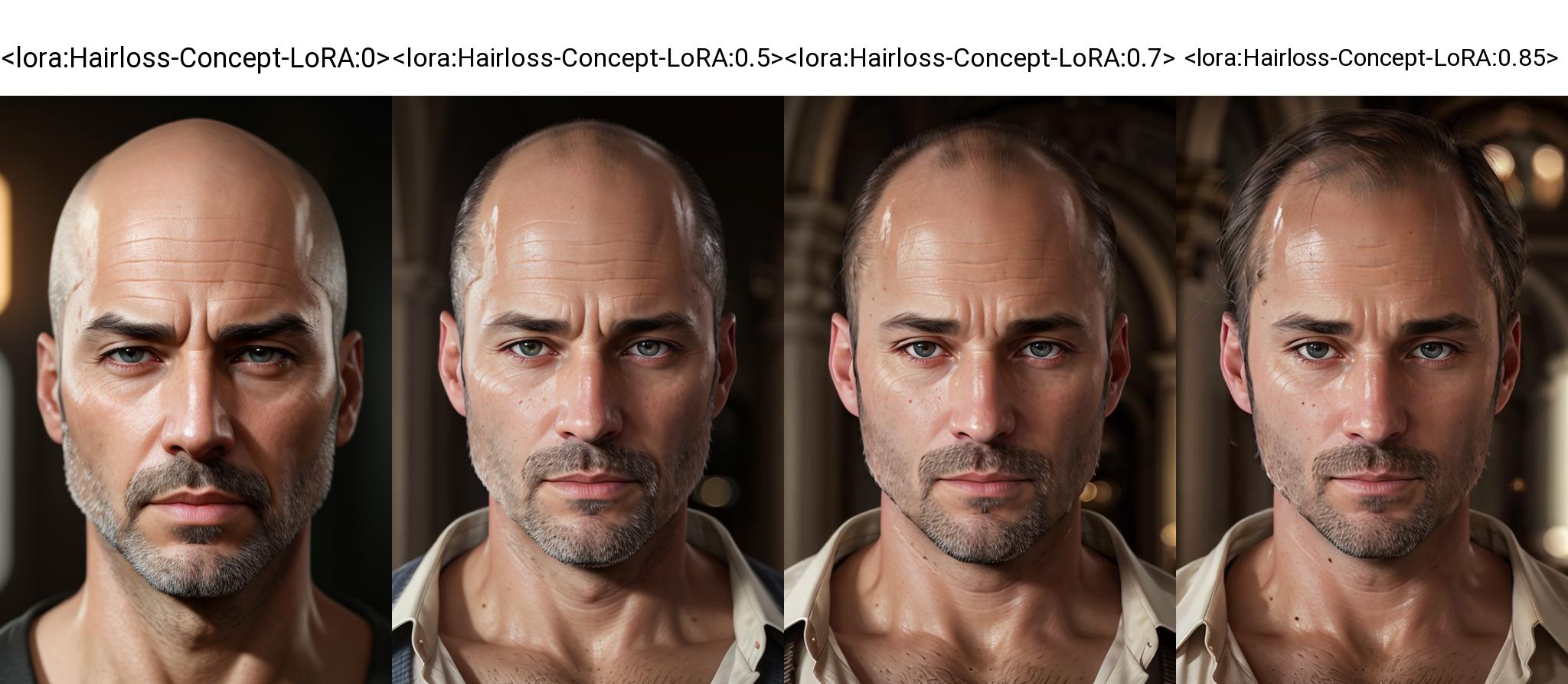 Introducing the Hairloss concept LoRA model for Stable Diffusion 1.5. Enhance your creative process with the addition of a unique hair loss concept, offering a variety of styles to diversify your generated images. With this LoRA, you can easily incorporate features like receding hairlines, thinning hair, buzzcuts, combovers, power donuts, and even the daring skullet! Unleash a new level of possibilities for character design, storytelling, and artistic expression with this model. It works well across a large variety of checkpoint models, including Deliberate, Realistic Vision, Protogen, and more. For most cases, I would recommend using the LoRA at a strength of 0.7 or 0.8. The trigger word is "hairloss" and supplimented by additional terms for styles such as "balding", "combover", "thinning hair", "skullet", "buzz cut", "high widows' peak".