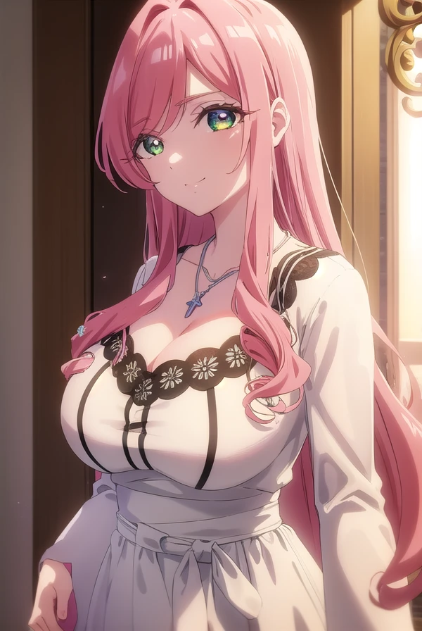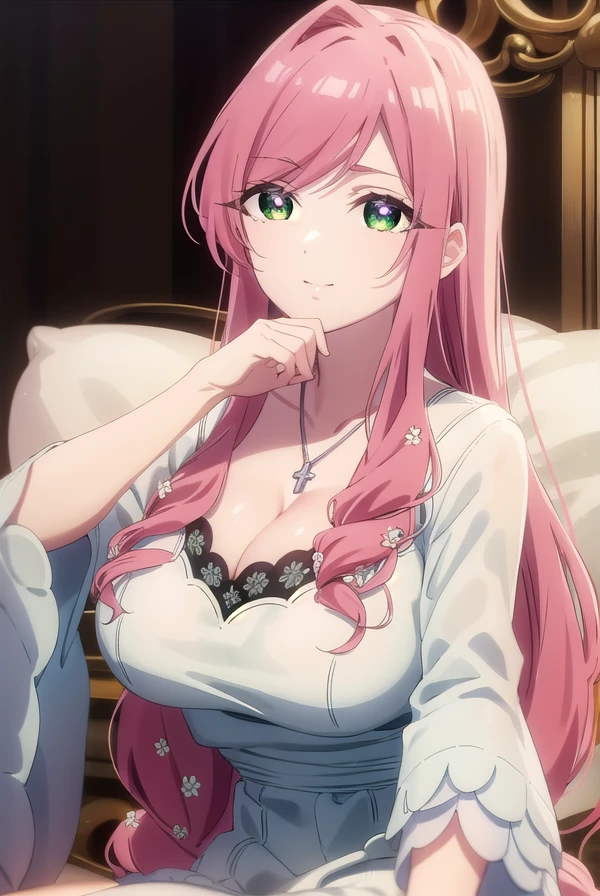 hahari hanazono, long hair, bangs, (green eyes:1.2), pink hair, flower, hair flower,