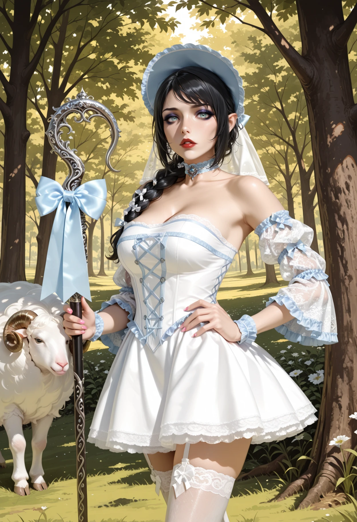 white dress, thighhighs, thighbows, decorative bows, zettai ryouiki, blue cuffs, makeup, detached sleeves, blue frills, lace sleeves, cross-laced clothing, strapless, choker, oversized bonnet, frilled bonnet, blue bow, large bow, center bows, pink nails