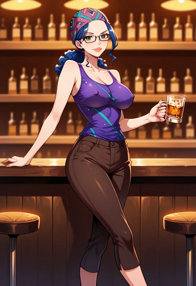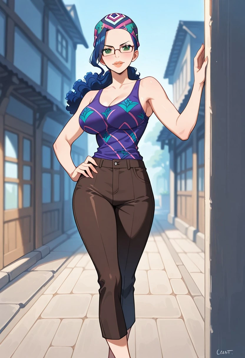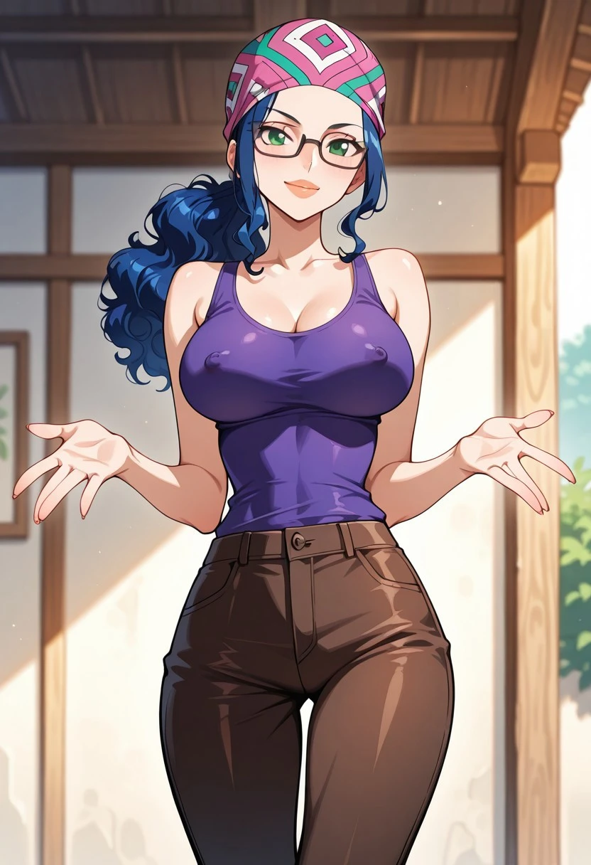 ZalaMDOP, 1girl, solo, tall woman, slim woman, long hair, dark-blue hair, curly hair, thick lips, dark green eyes, pale skin, curvaceous figure, large breast, wide hips, sexy woman, hip swings, yellow crystal square glasses, diamond-patterned bandanna, tank-top, dark brown low-riding pants, platform sandals, ponytail, purple tank top with pink embroideries drawn across it and green ornaments,