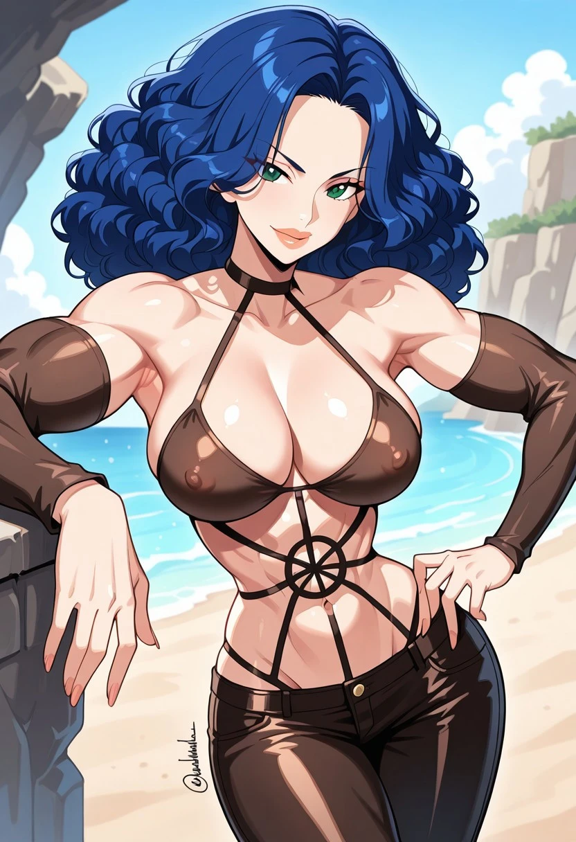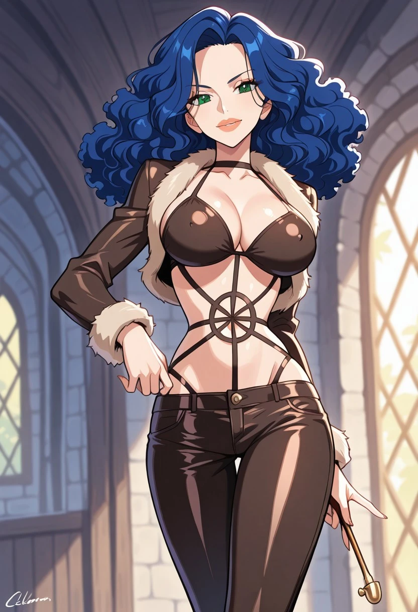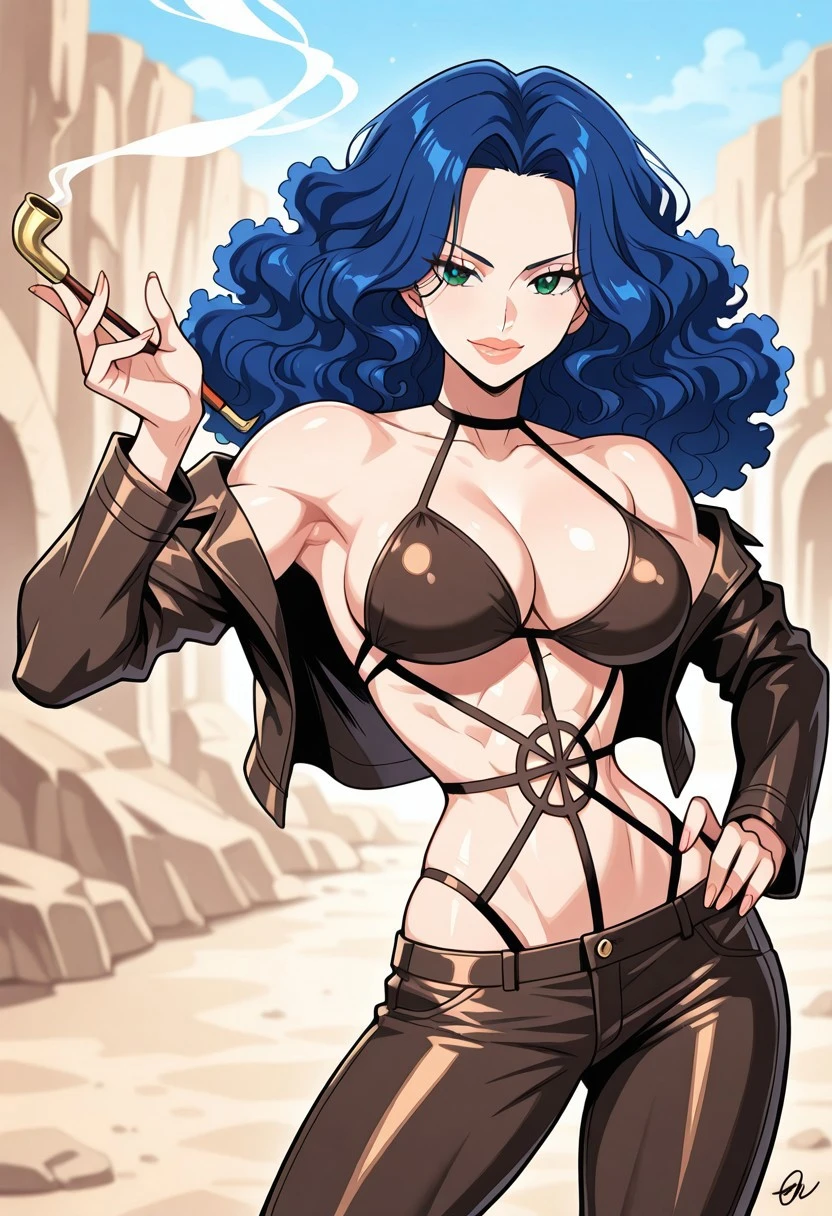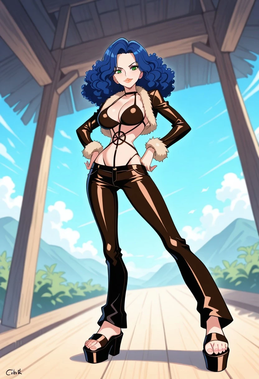 ZalaMDOP, 1girl, solo, tall woman, slim woman, long hair, dark-blue hair, curly hair, thick lips, dark green eyes, pale skin, curvaceous figure, large breast, wide hips, sexy woman, hip swings, revealing outfit, dark brown short jacket, beige colored fur trims, long sleeves, bikini top, low-riding leather pants, platform sandals, smoking pipe, navel, midriff, groin, spider web-like pattern across her abdominal area,