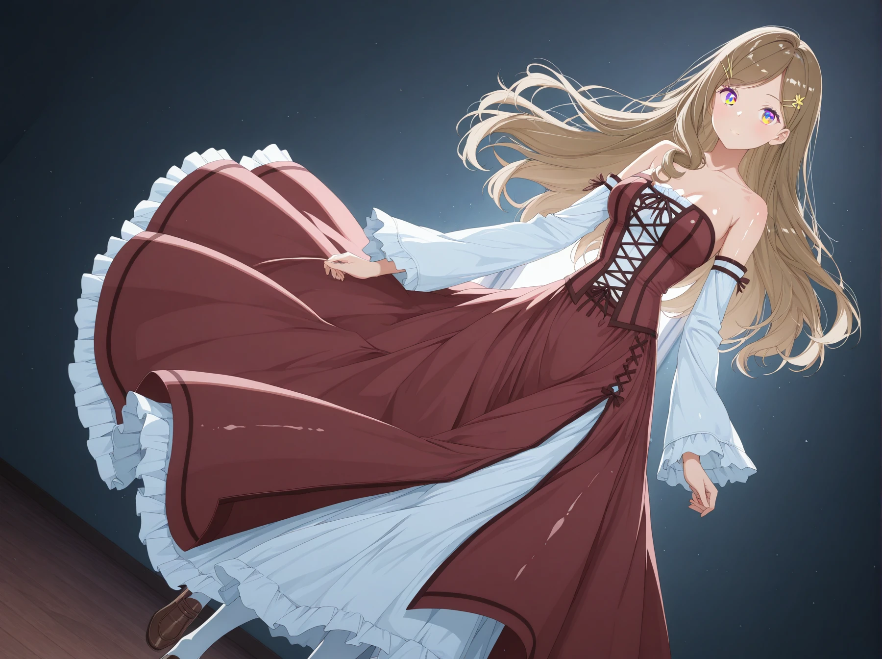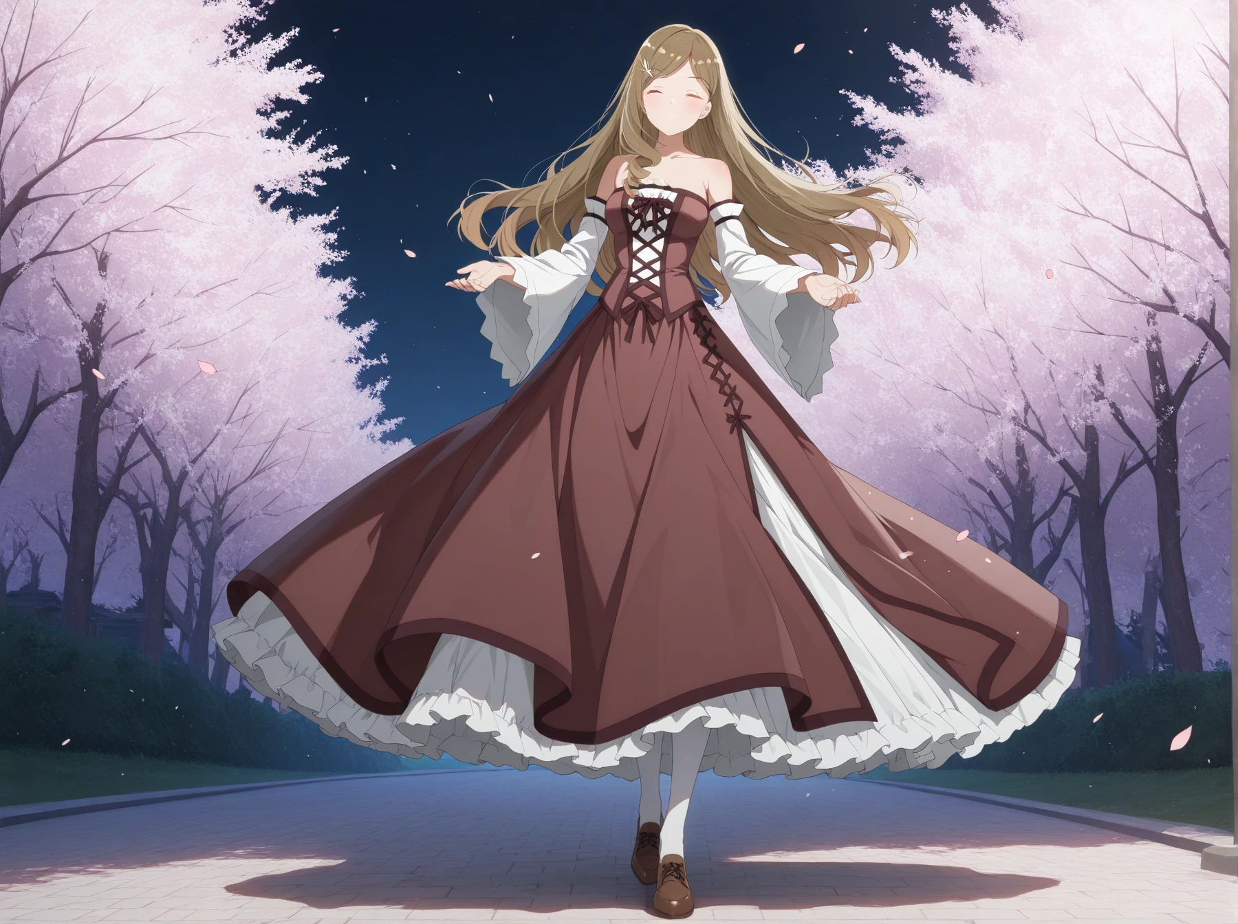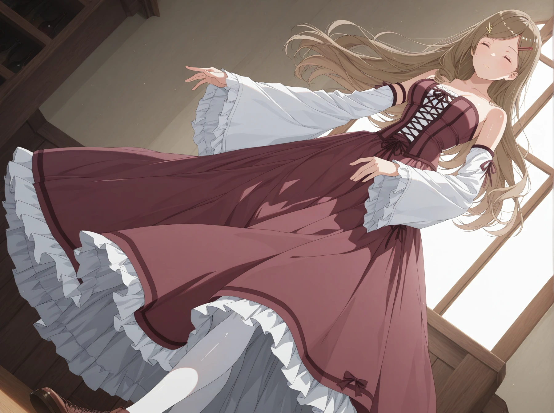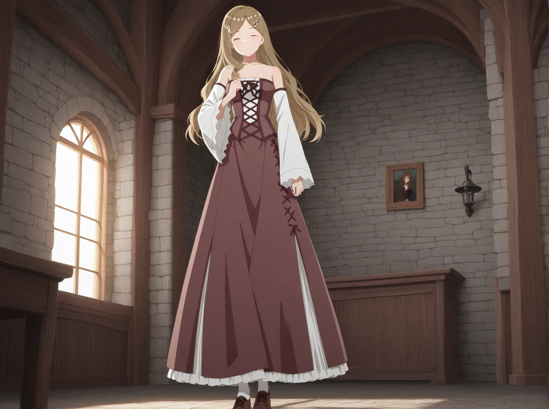 Clothes: (sleeveless dress, brown dress, white slit, long dress, detached sleeves, wide sleeves, bare shoulders, white pantyhose, brown shoes)