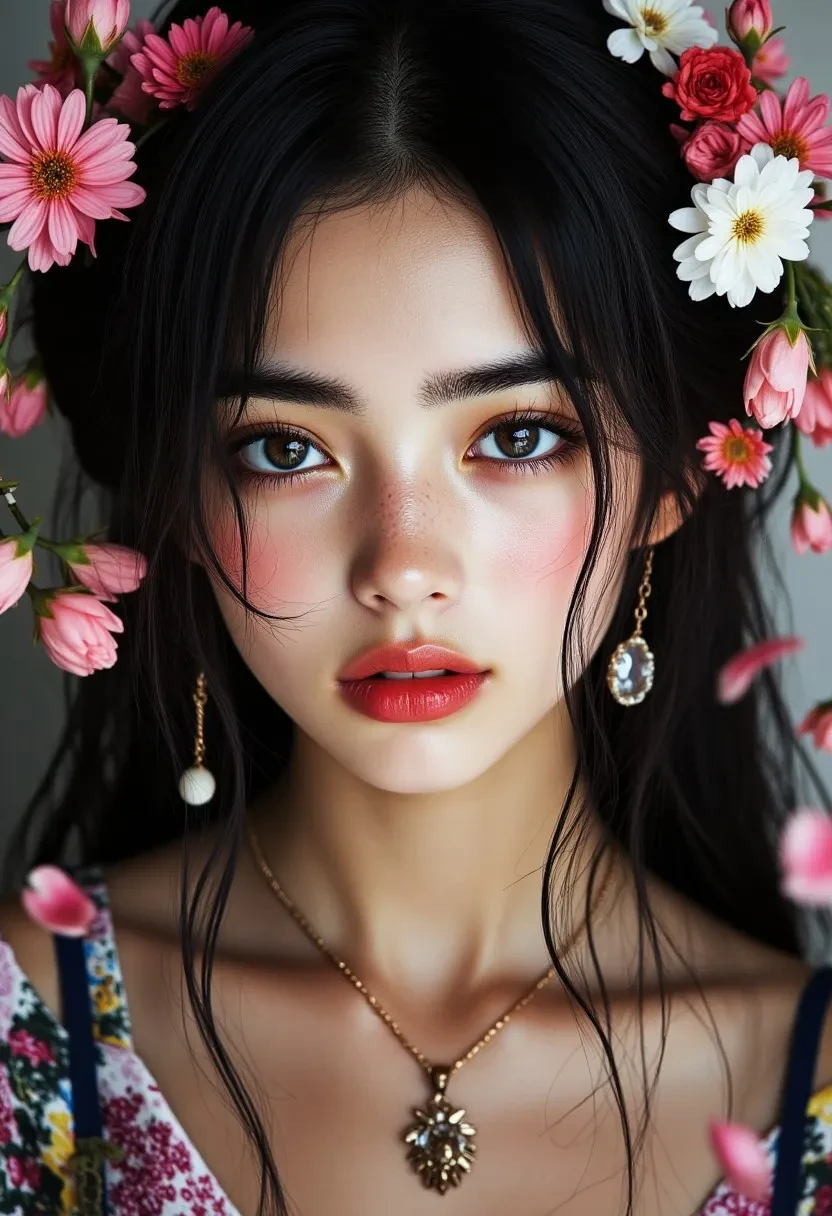 Her hair is adorned with beautifully cold-colored white flowers and delicate snowflake crystals, as if dusted like on a Christmas tree, sparkling like jewels. Fine particles of sequins are scattered throughout, enhancing the beauty of these ornaments and making her already stunning face shine even more radiantly.