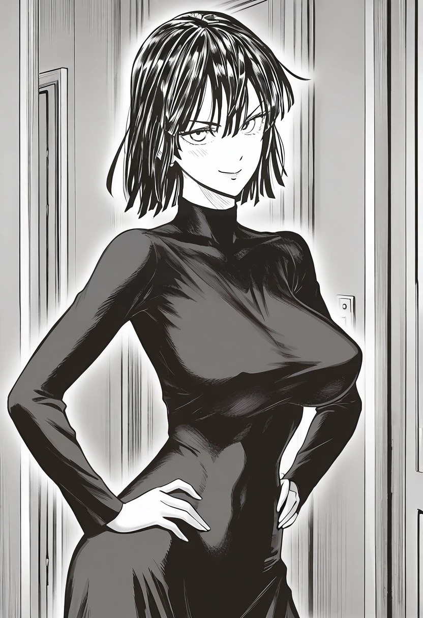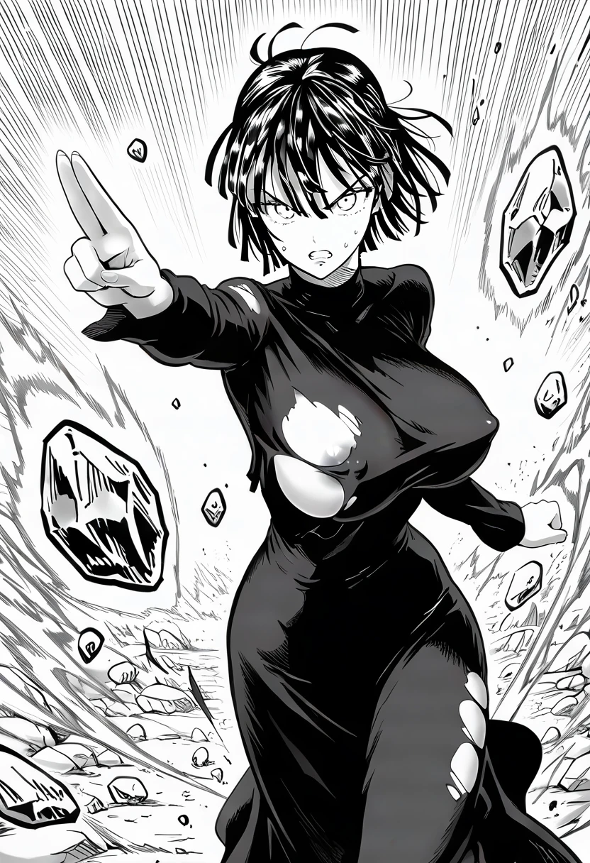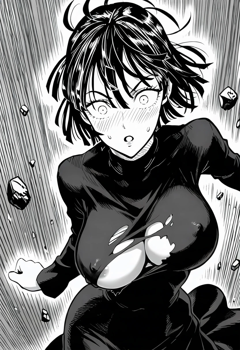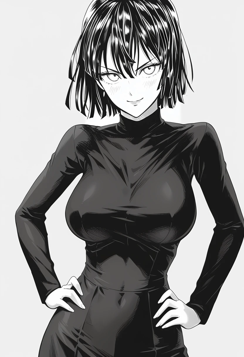 fubuki (one-punch man), 1girl, solo, white eyes, black hair, short hair, bangs, hair between eyes, huge breasts,