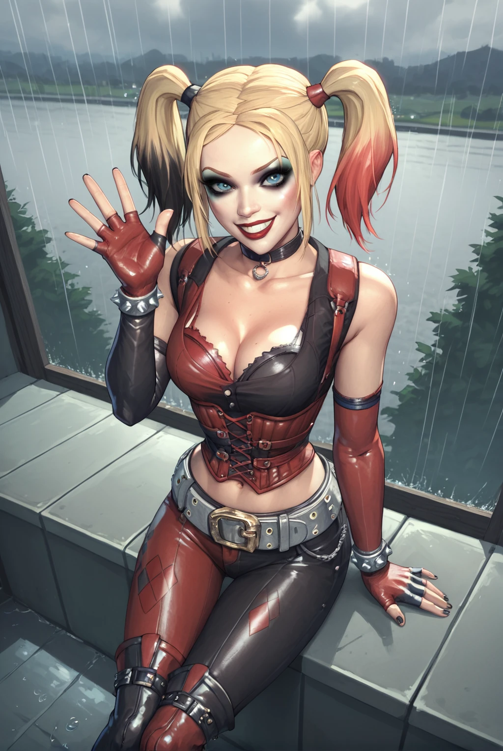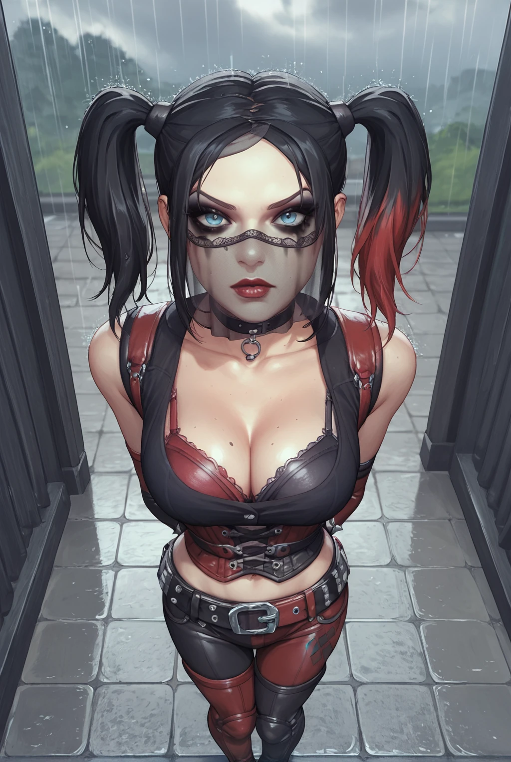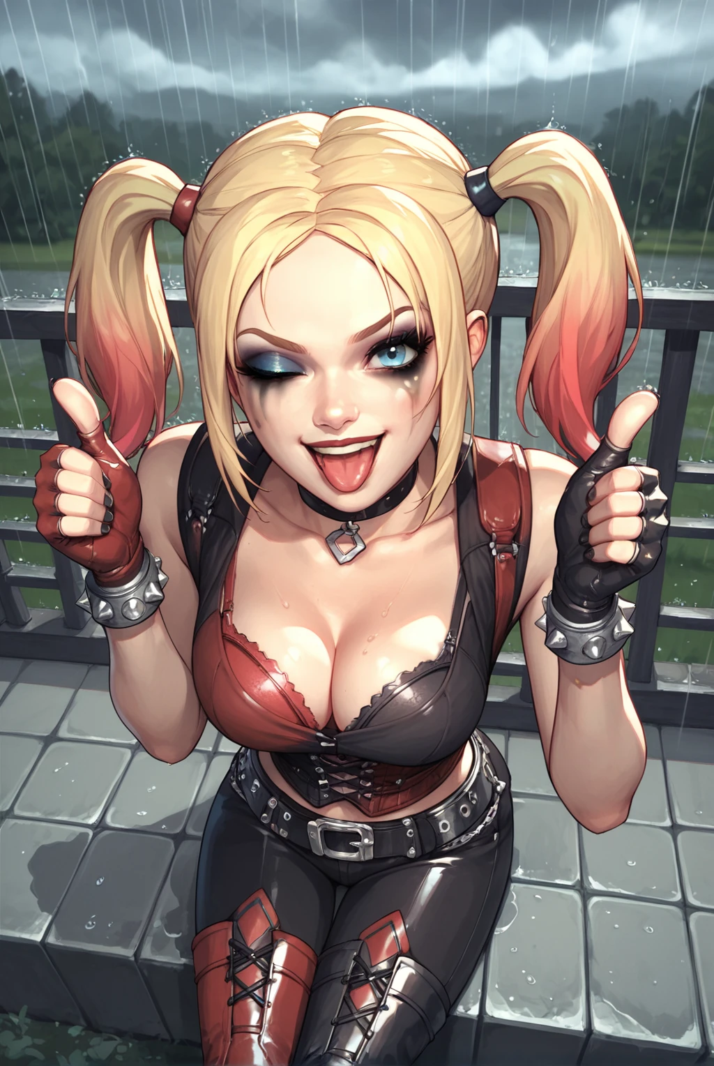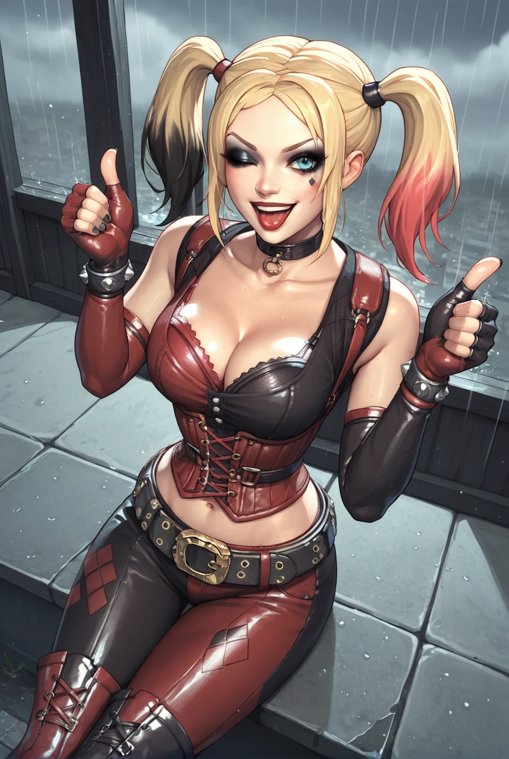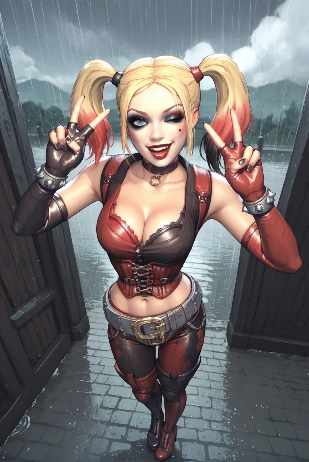 blue eyes, blonde hair, fingerless gloves, cleavage, twintails, multicolored hair, choker, thigh boots, platform boots, Harley bac outfit, asymmetrical footwear, red corset, elbow gloves, multicolored clothes, belt, white makeup, clown makeup, bra, multicolored pants, multicolored gloves, multicolored shirt, sleeveless shirt