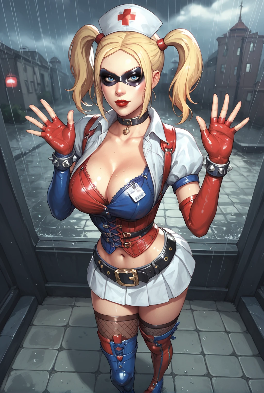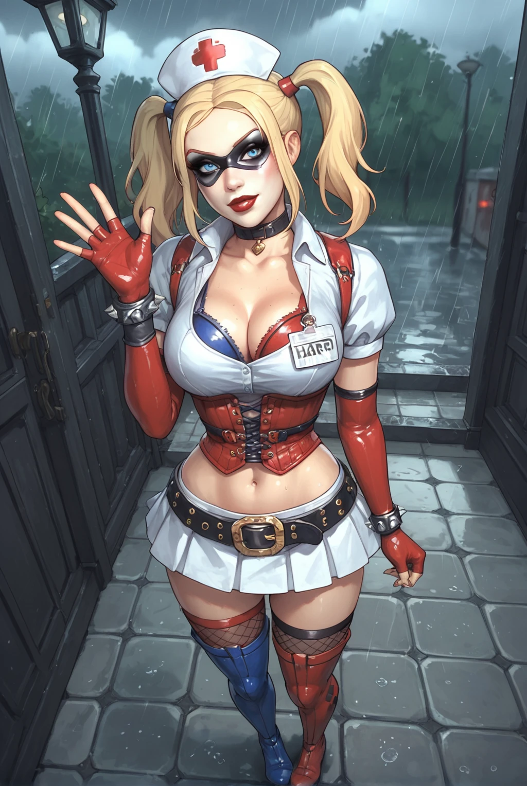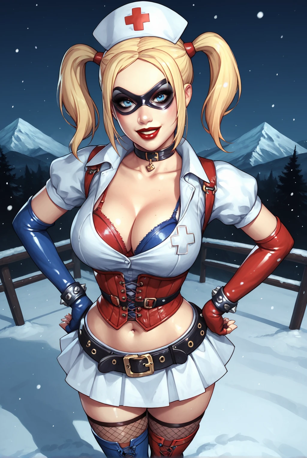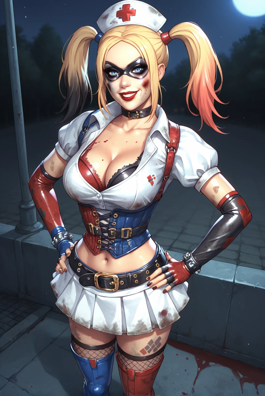long hair, blue eyes, large breasts, blonde hair, choker, belt, miniskirt, fingerless gloves, makeup, thigh boots, fishnet thighhighs, spiked bracelet, red and blue boots, platform boots, mask, domino mask, Harley nurse outfit, bra, corset, fishnet thighhighs, white shirt, navel, midriff, elbow gloves, multicolored boots, multicolored gloves, white makeup, clown makeup, white skirt, red lips
