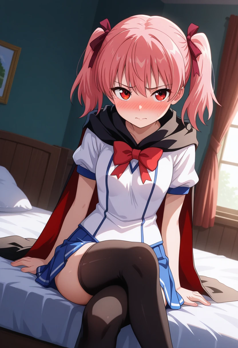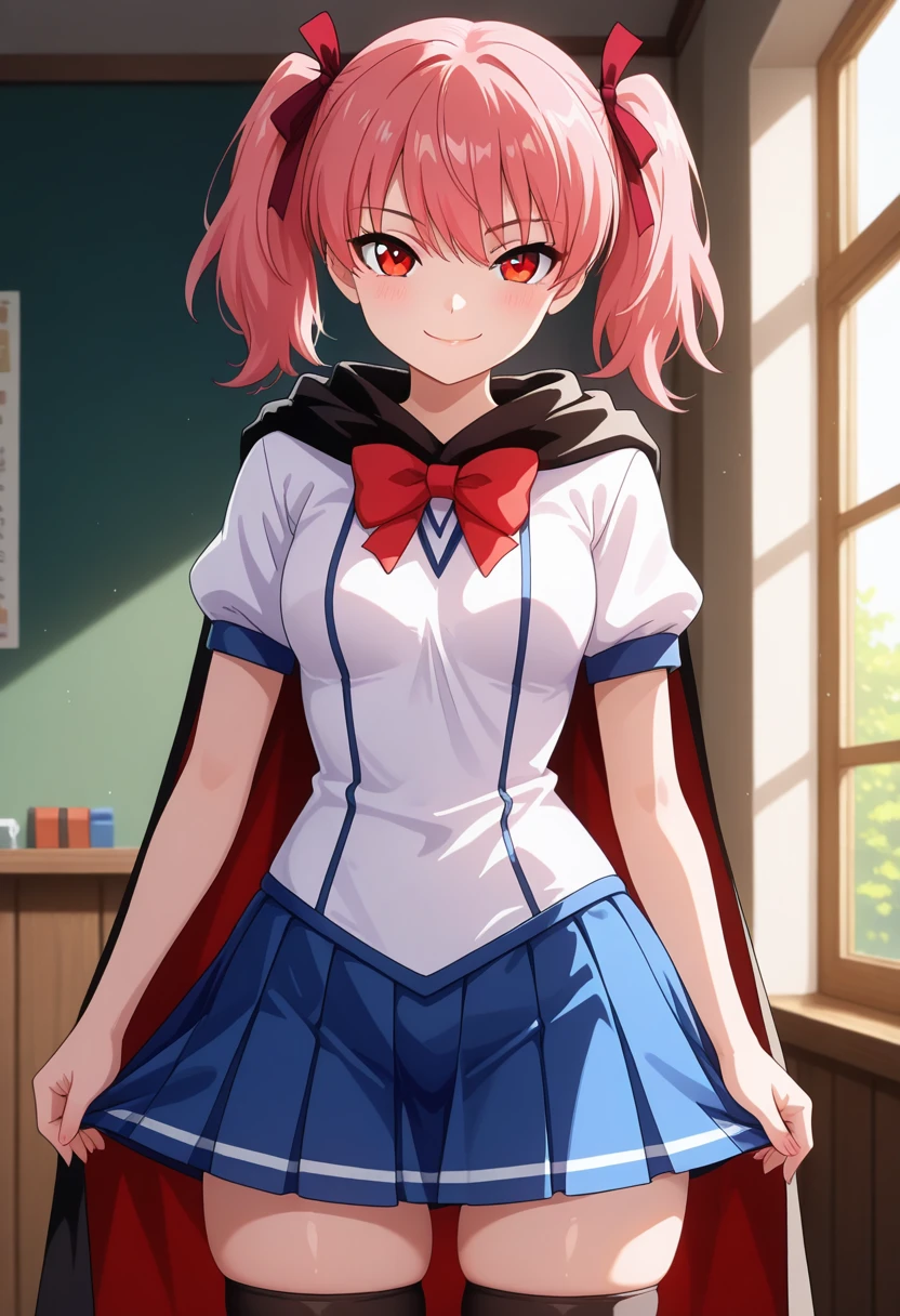 school uniform, black cape, white school shirt, short sleeves, red bowtie, blue pleated skirt, black thighhighs, zettai ryouiki, loafers,