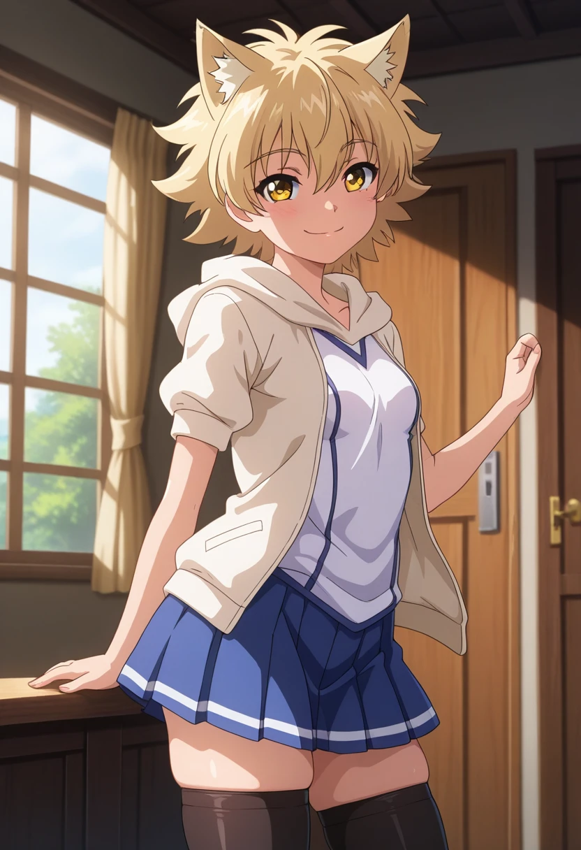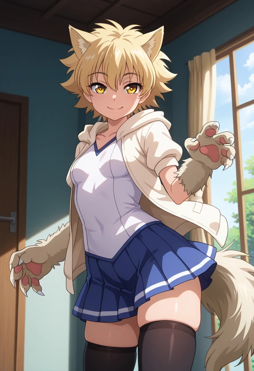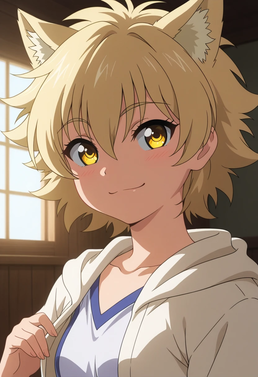 kannaww, wolf ears, extra ears, yellow eyes, blonde hair, short hair, small breasts,