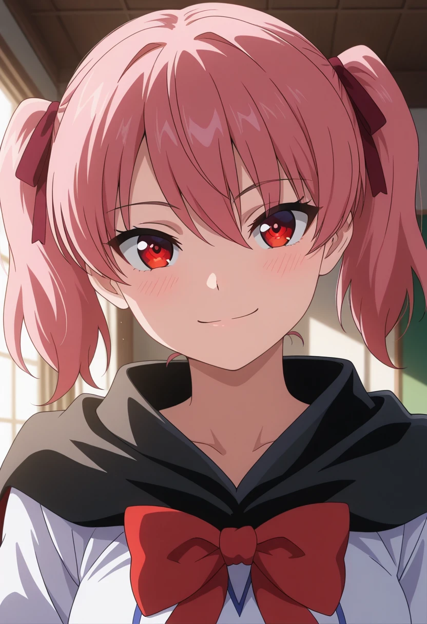 michieww, red eyes, pink hair, twintails, short twintails, red hair ribbon,