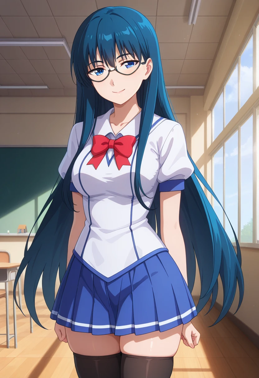 school uniform, white school shirt, short sleeves, red bowtie, blue pleated skirt, black thighhighs, zettai ryouiki, loafers,