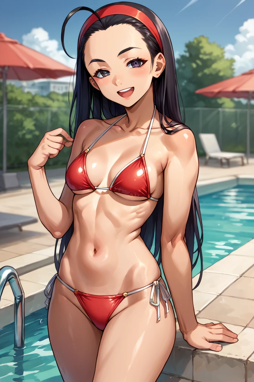 red gym uniform, open jacket, white shirt, black buruma, forehead, red hairband, black hair, long hair