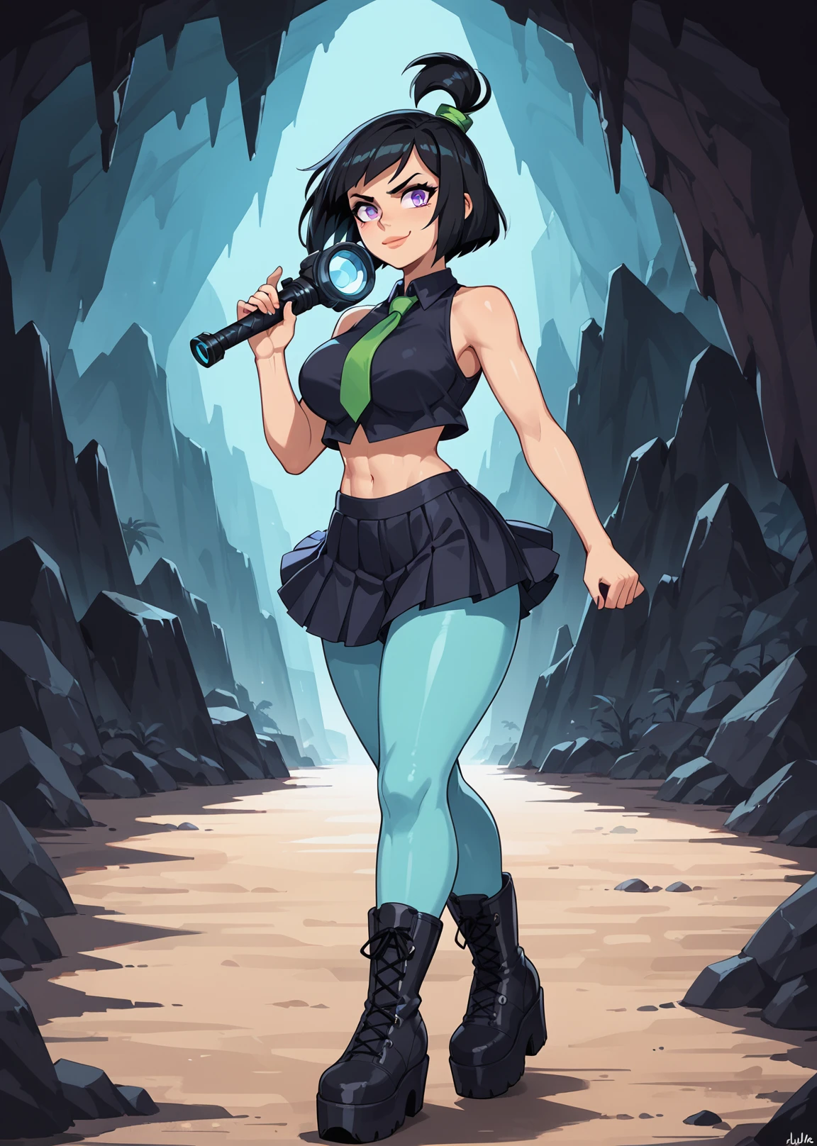 Trigger words: 1girl, solo, black hair, goth, purple lipstick, eyeshadow, high ponytail, short hair, dark skin, black shirt, sleeveless, midriff, plaid skirt, light purple pantyhose, black platform boots, grey soles