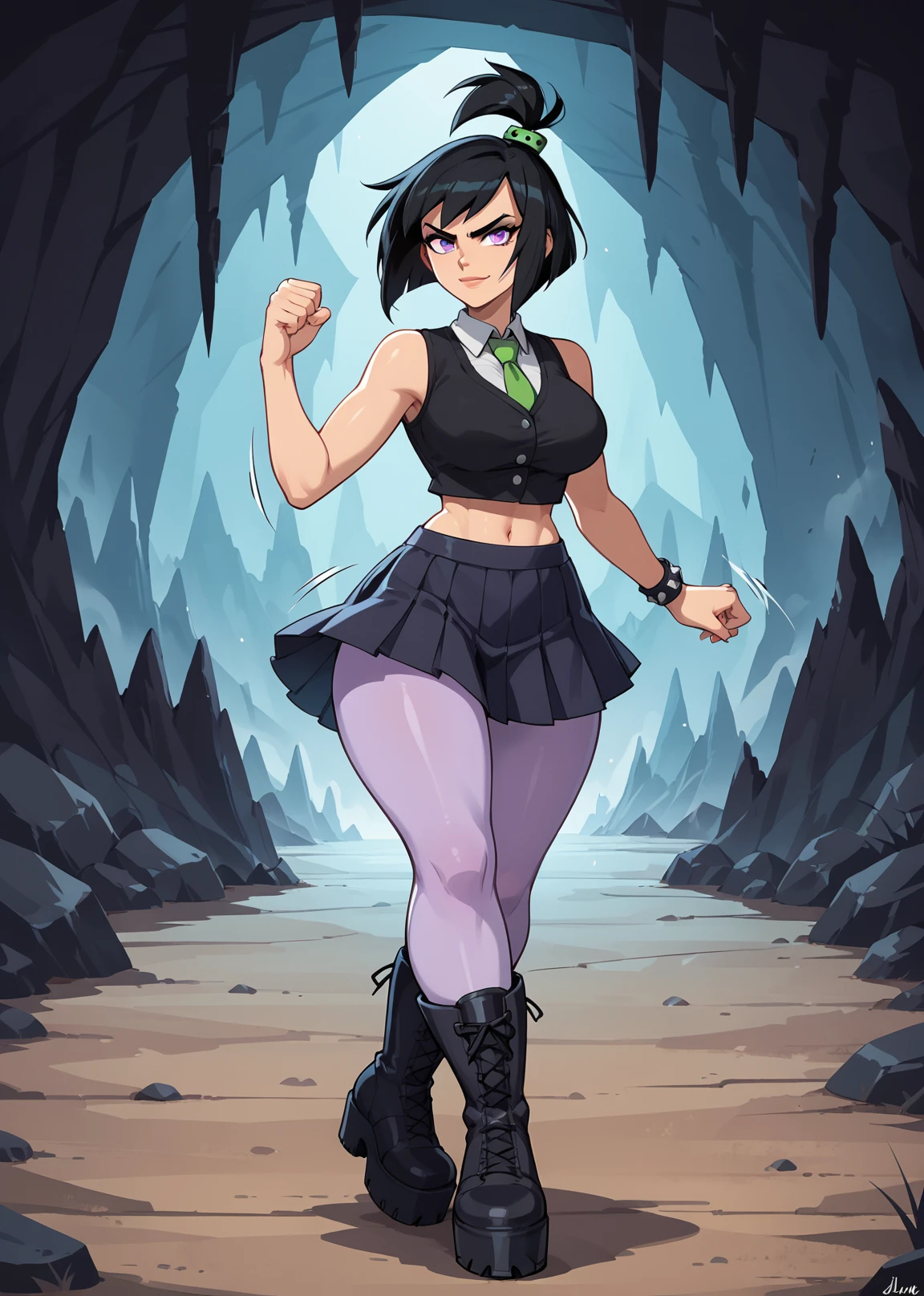 black hair, high ponytail, dark skin, dark skinned-female, purple lipstick, eyeshadow, black shirt, sleeveless, midriff, black plaid skirt, light purple pantyhose, black platform boots, grey soles