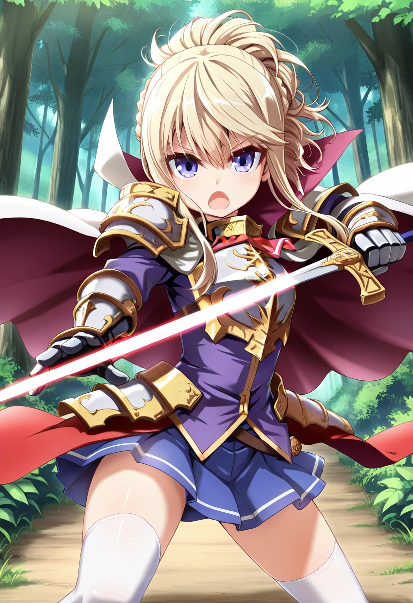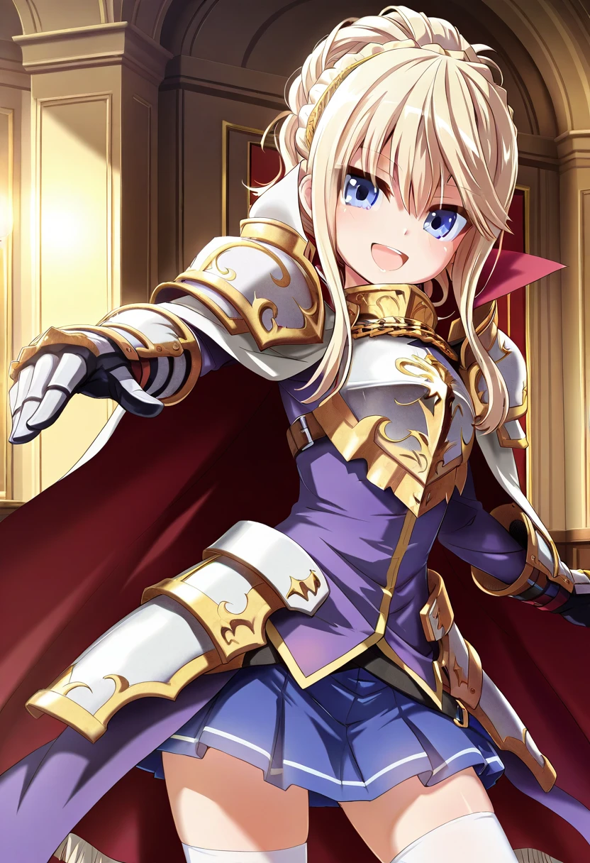 armored dress, breastplate, shoulder armor, gauntlets, cape, blue skirt, white thighhighs,