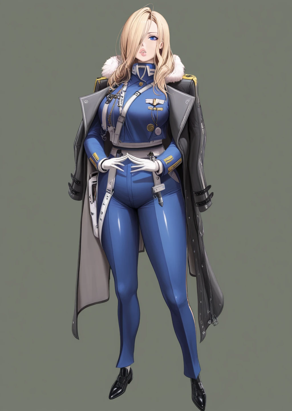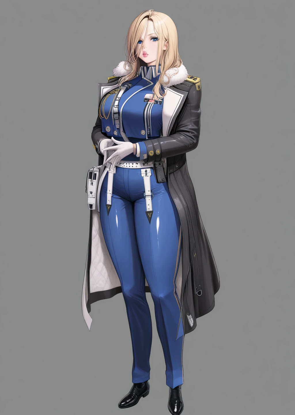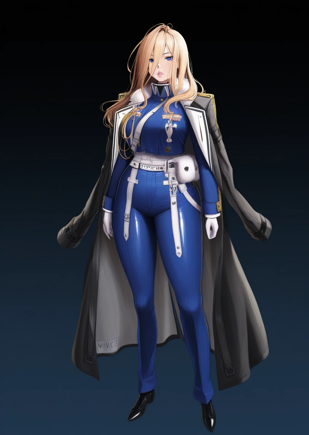 Prompts: blonde hair, puffy lips, blue eyes, black coat, blue uniform,
