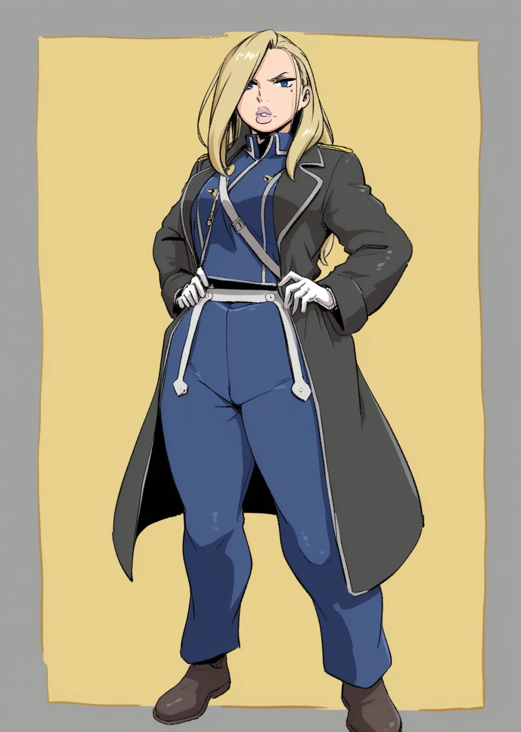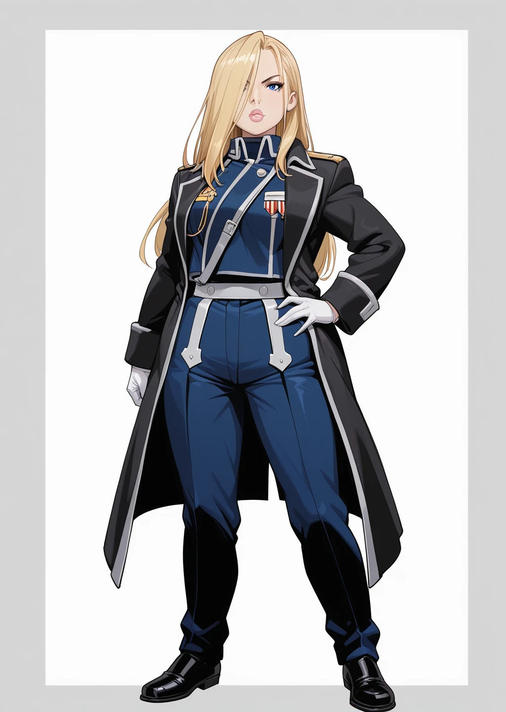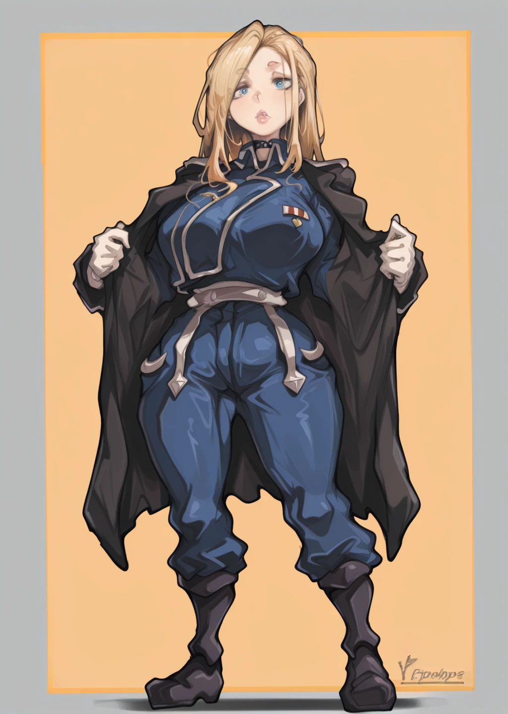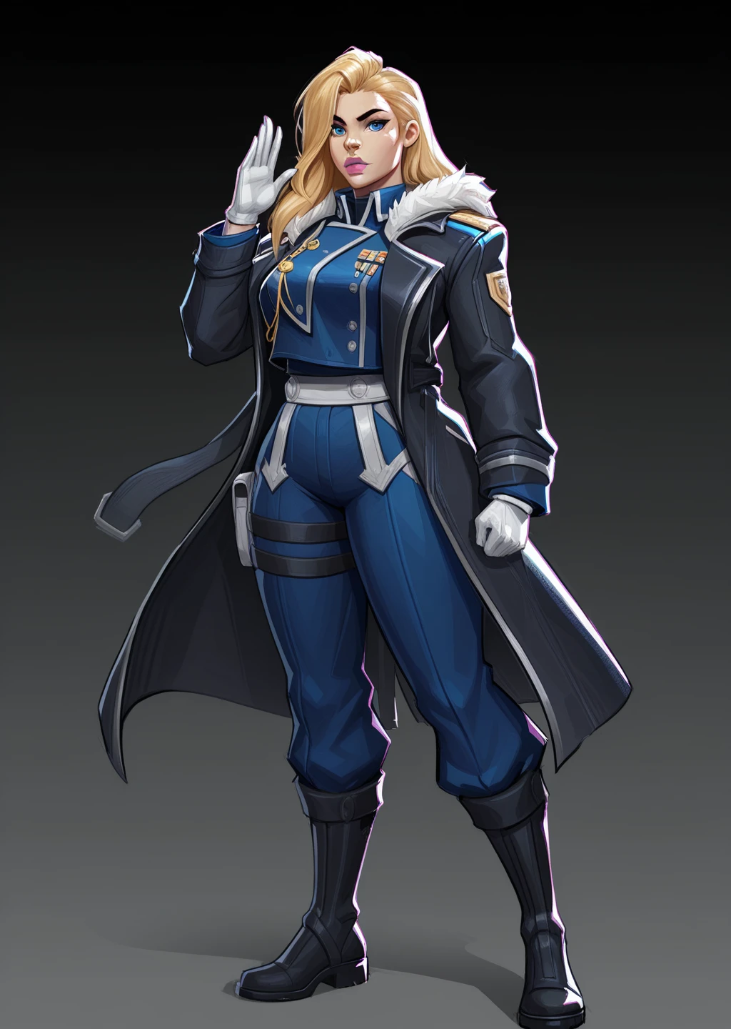 Prompts: blonde hair, puffy lips, blue eyes, black coat, blue uniform,