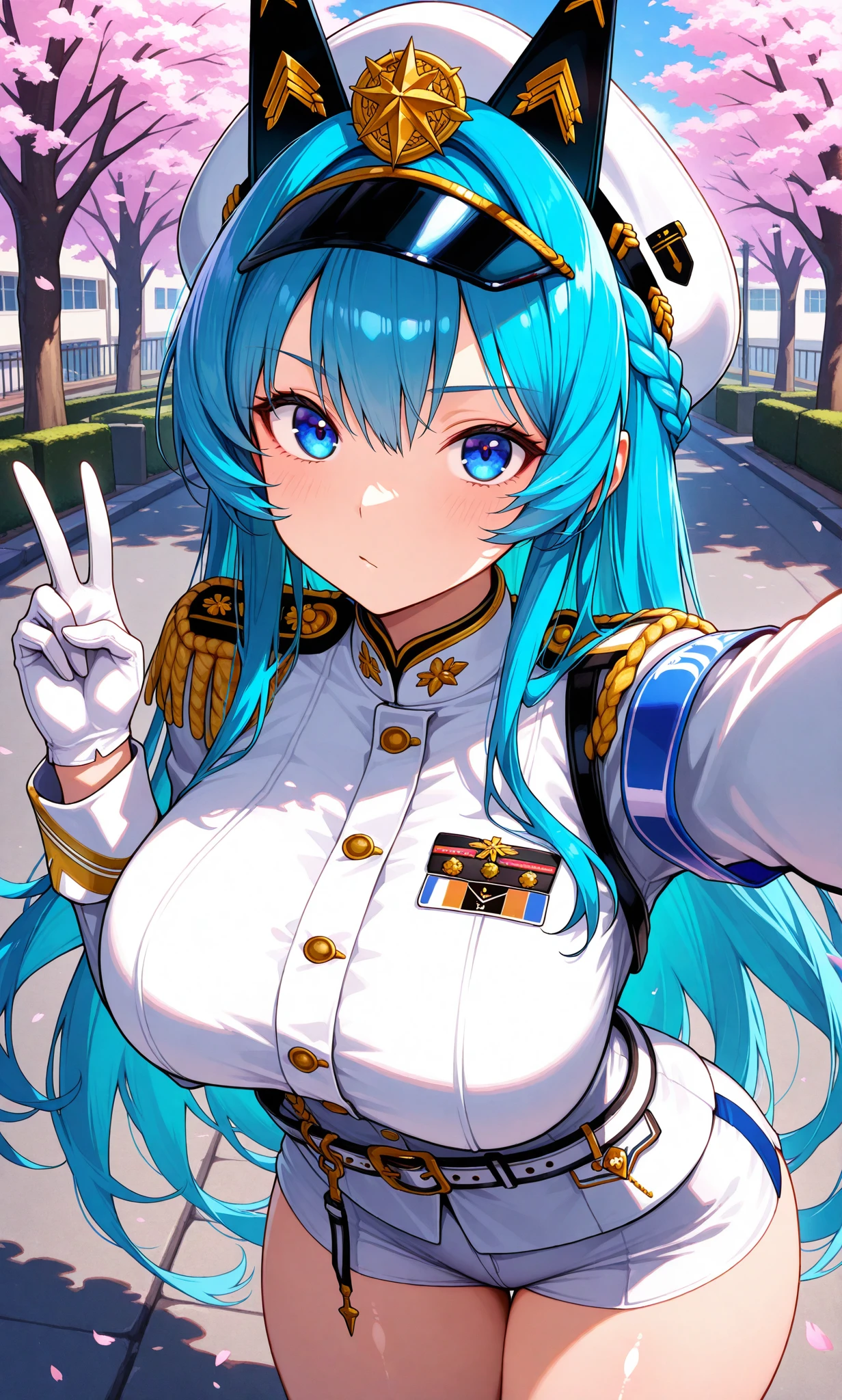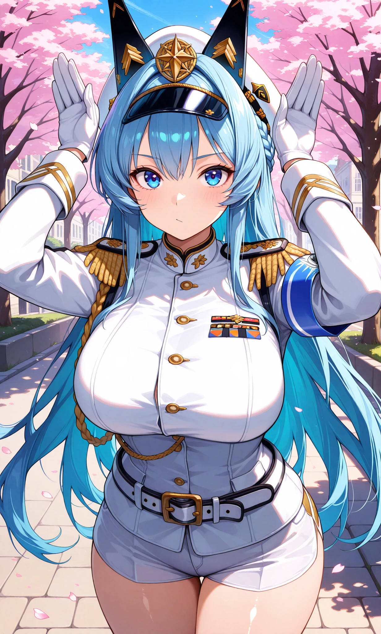 white hat, peaked cap, epaulettes, white gloves, military uniform, armband, white shorts, short shorts, white jacket, jacket on shoulders, white footwear, high heels
