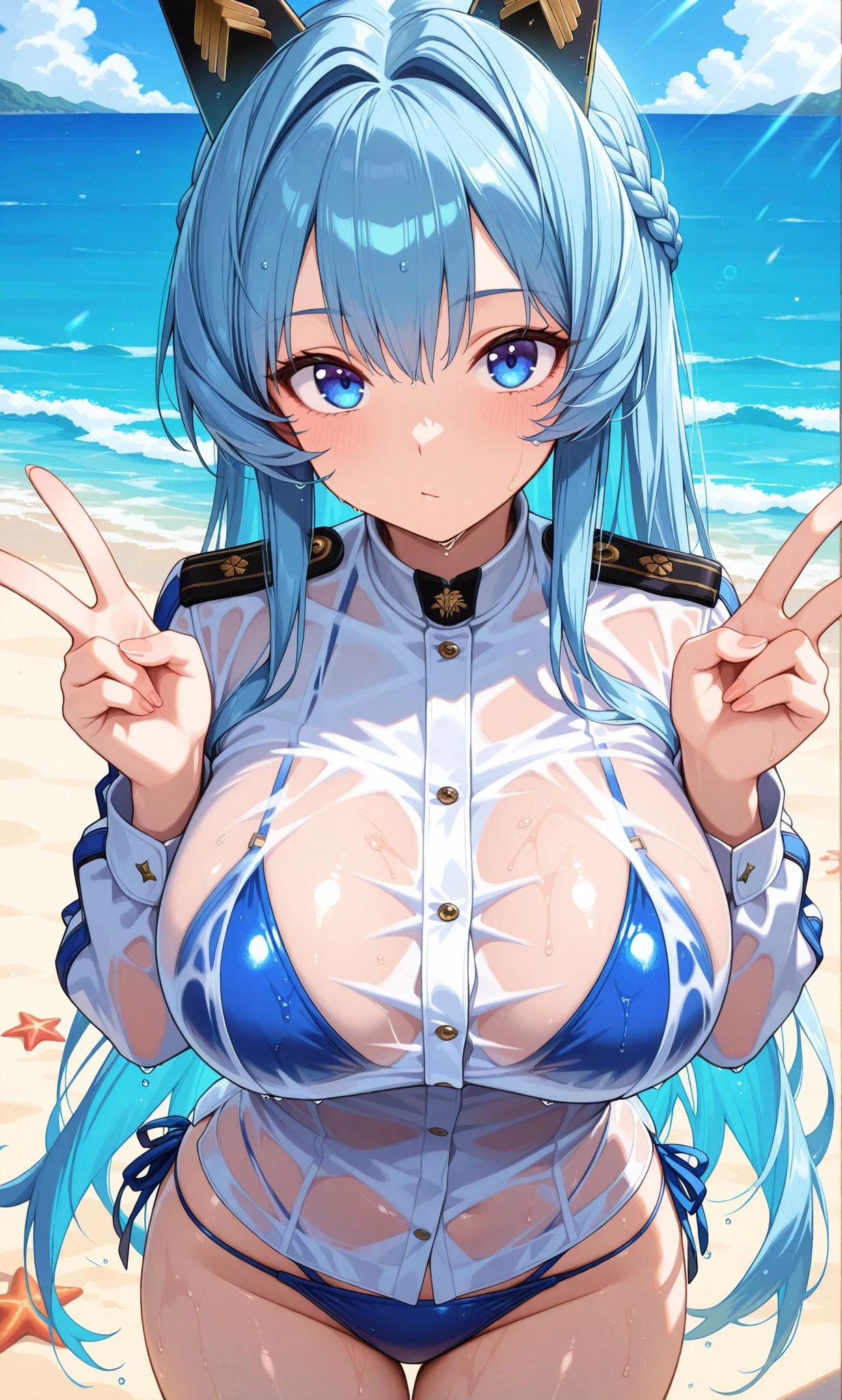 helm (nikke), blue eyes, blue hair, braid, long hair