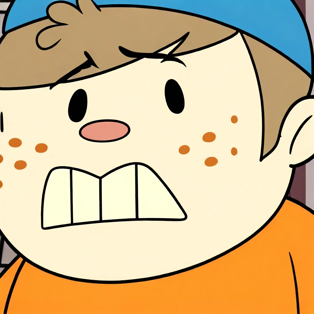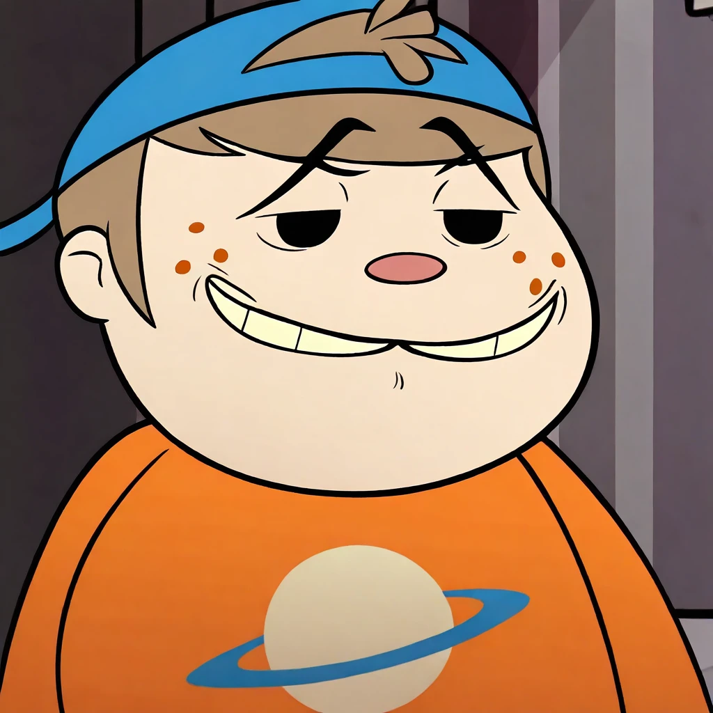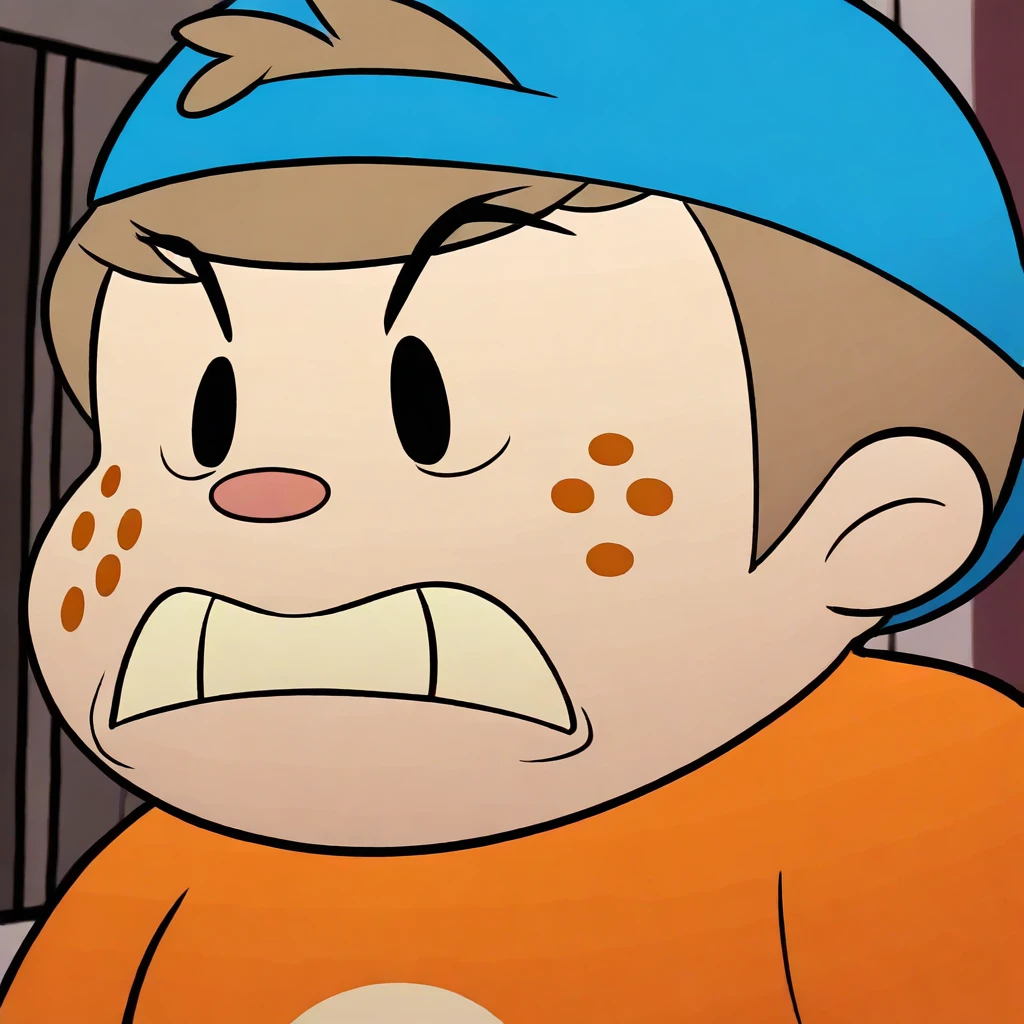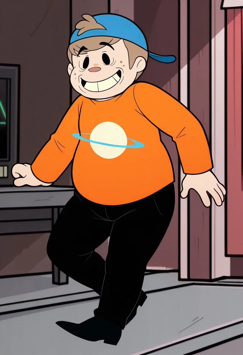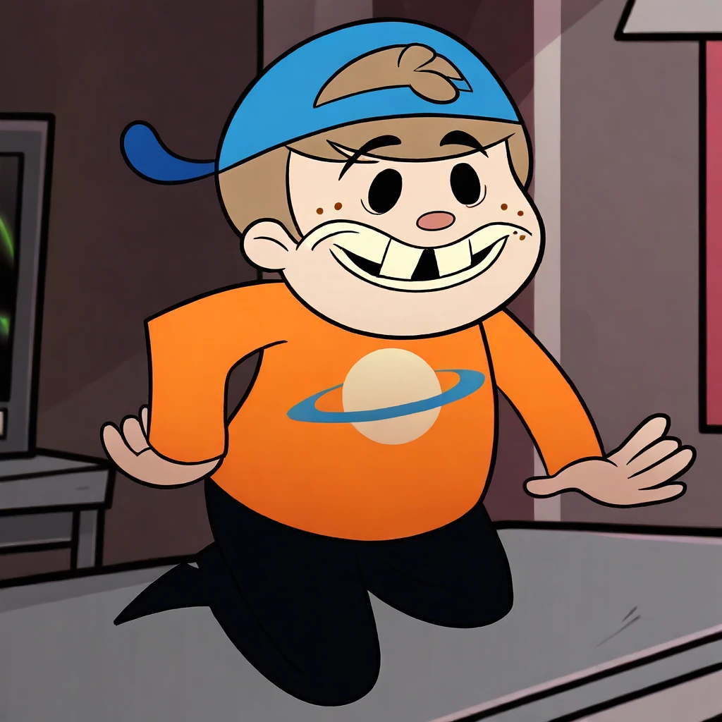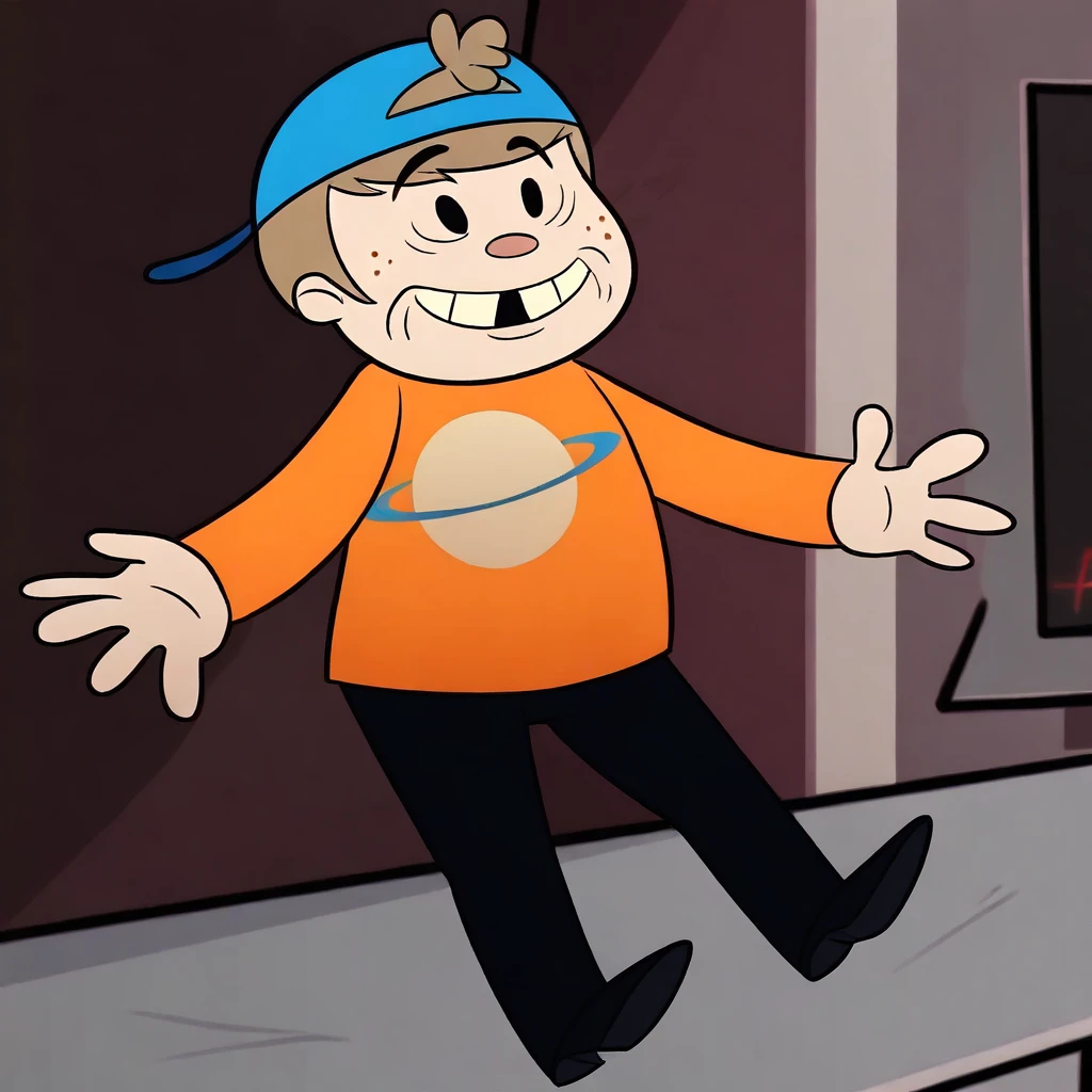Prompt: Eddie HB, solo, 1boy, black dot eyes, short size, chubby, shaggy hair, light brown hair, freckles, missing upper tooth, blue baseball cap, orange shirt, ringed planet logo, black pants, black shoes