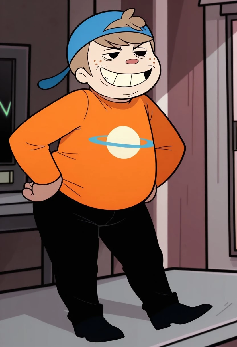 Eddie HB, solo, 1boy, black dot eyes, short size, chubby, shaggy hair, light brown hair, freckles, missing upper tooth, blue baseball cap, orange shirt, ringed planet logo, black pants, black shoes