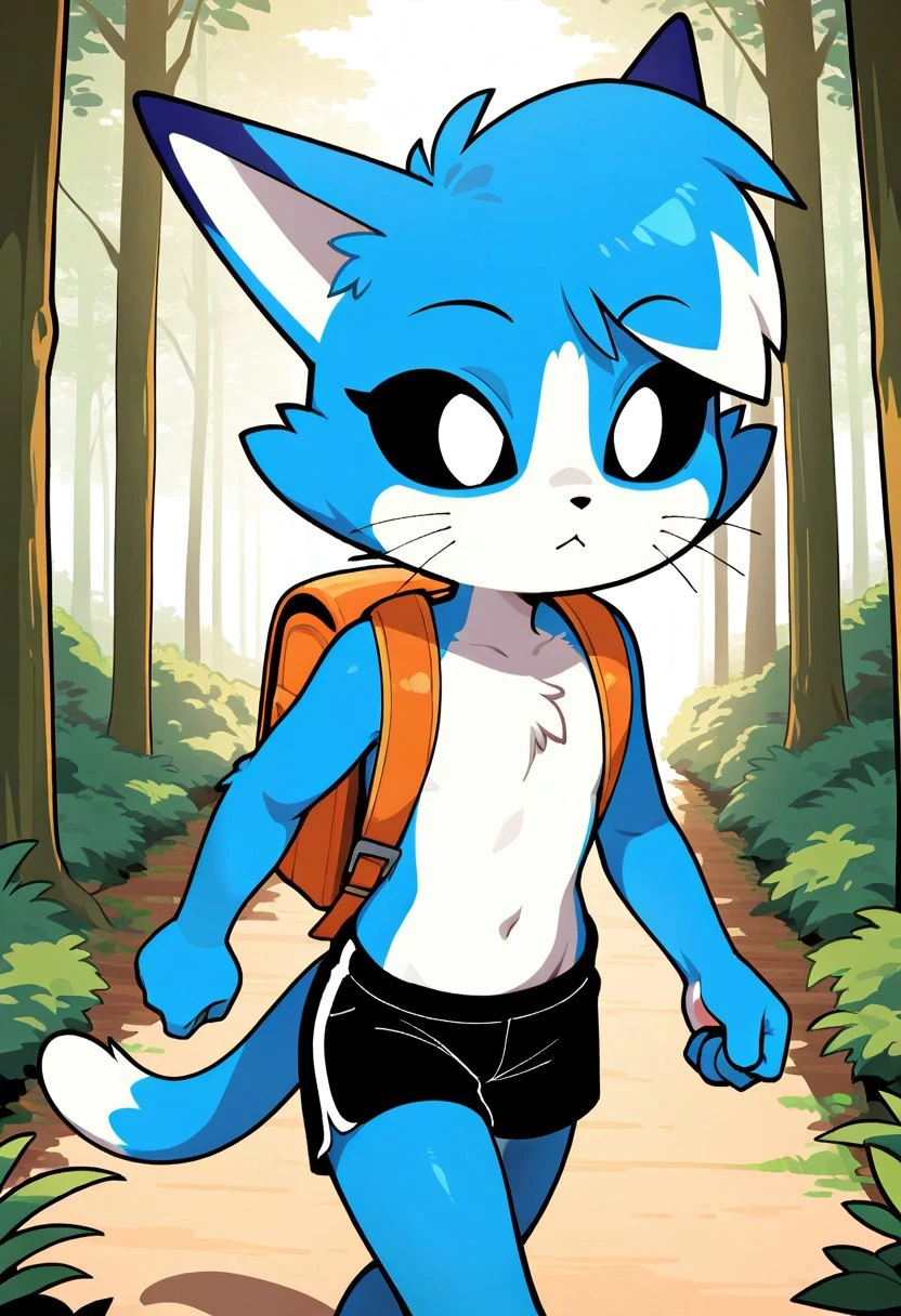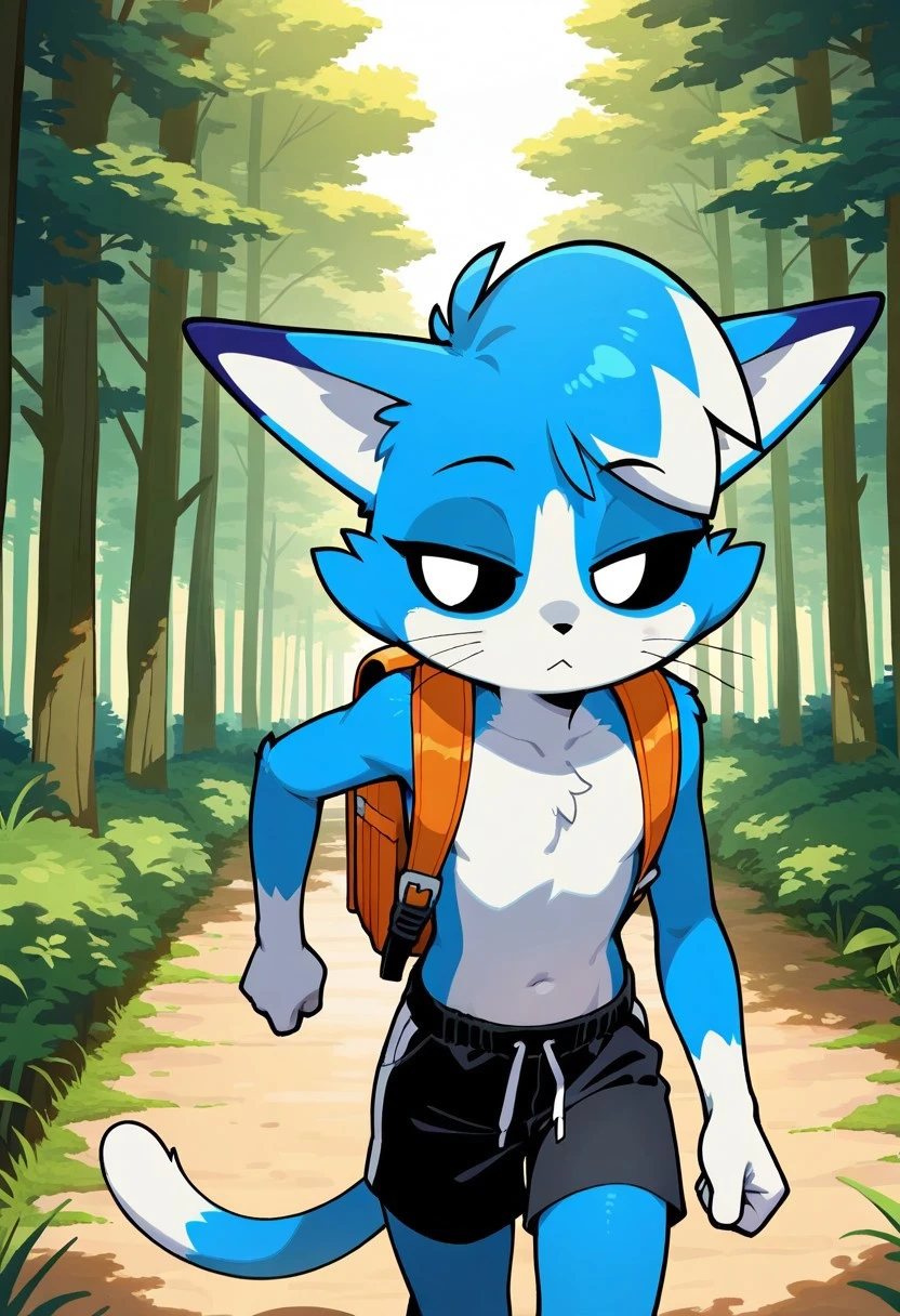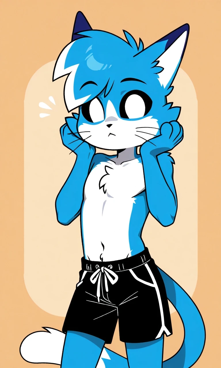 solo, anthro cat, blue fur, white stomach, cheek tufts, black scleras, white eyes, white inner ears, dark-blue ear tips, white tail tip, dipstick tail, side-swept hair, head tufts, cat whiskers
