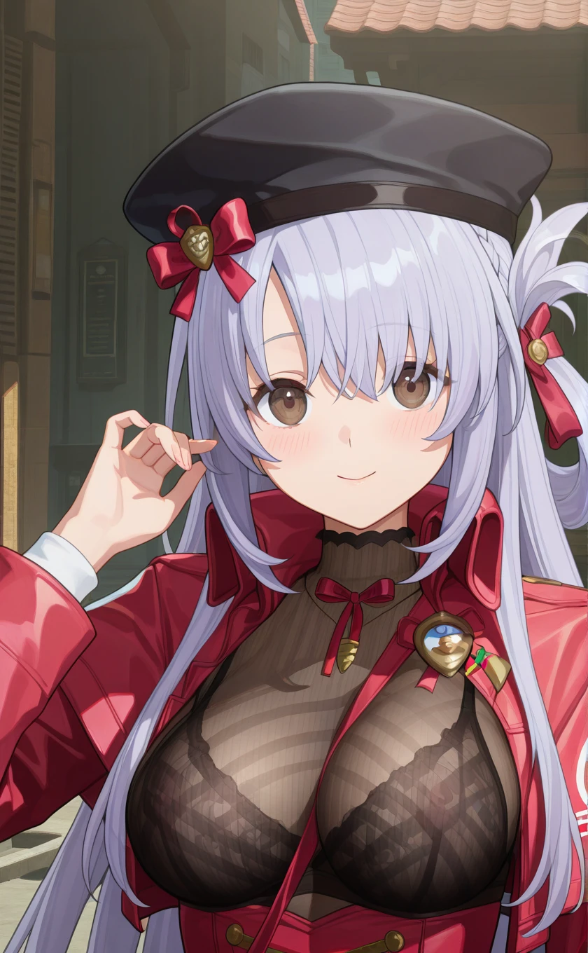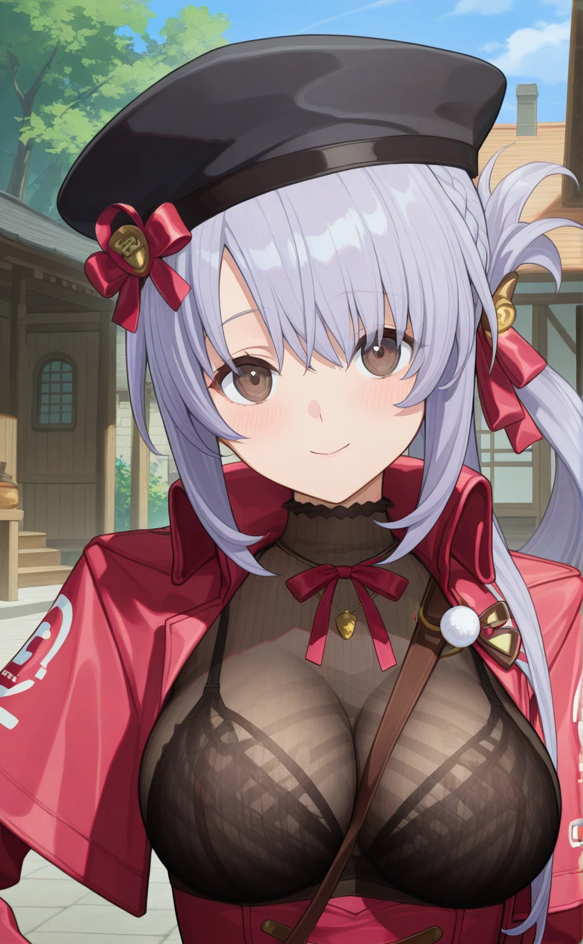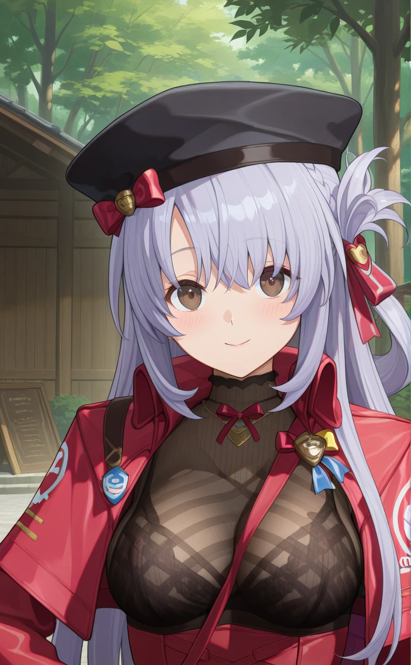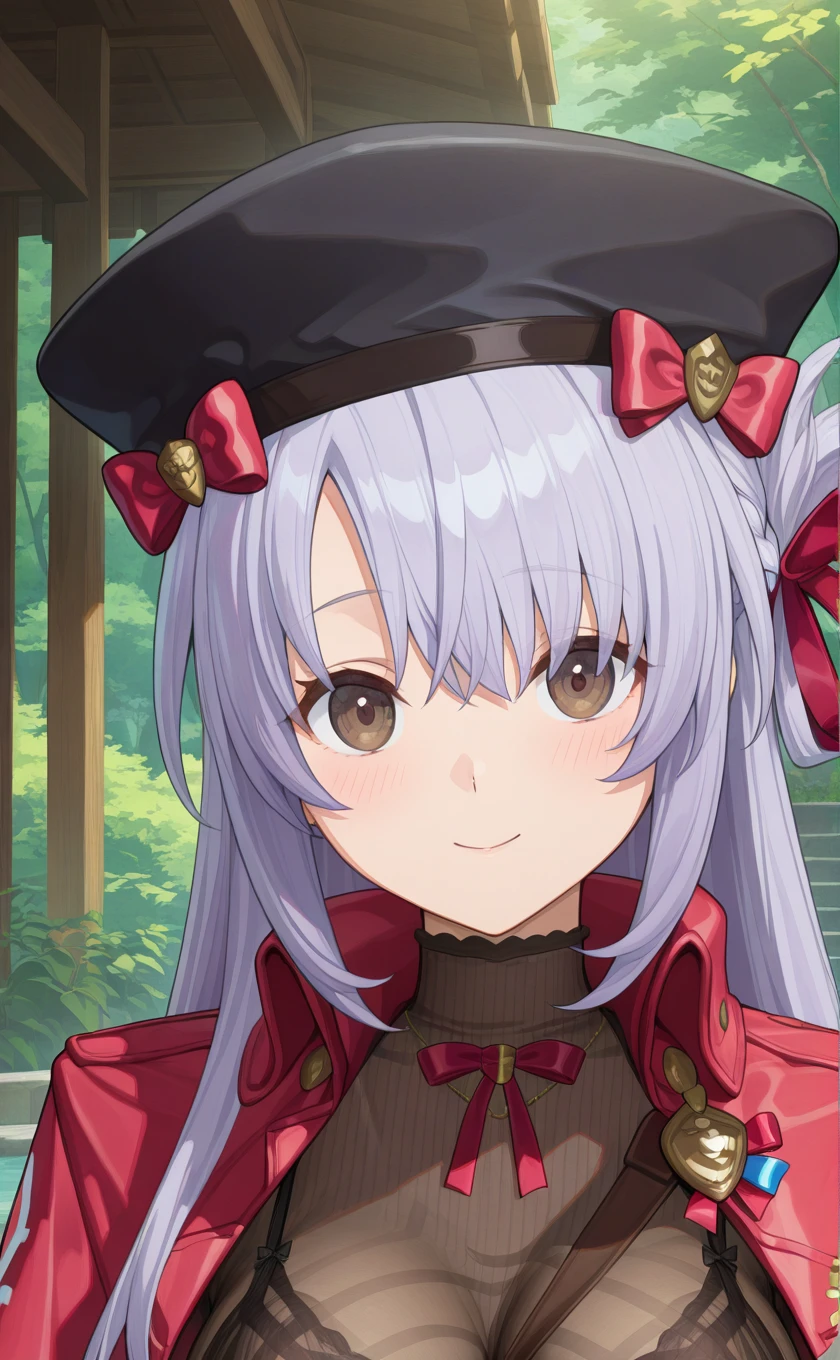 hat,black headwear,long hair,light purple hair,french braid,brown eyes