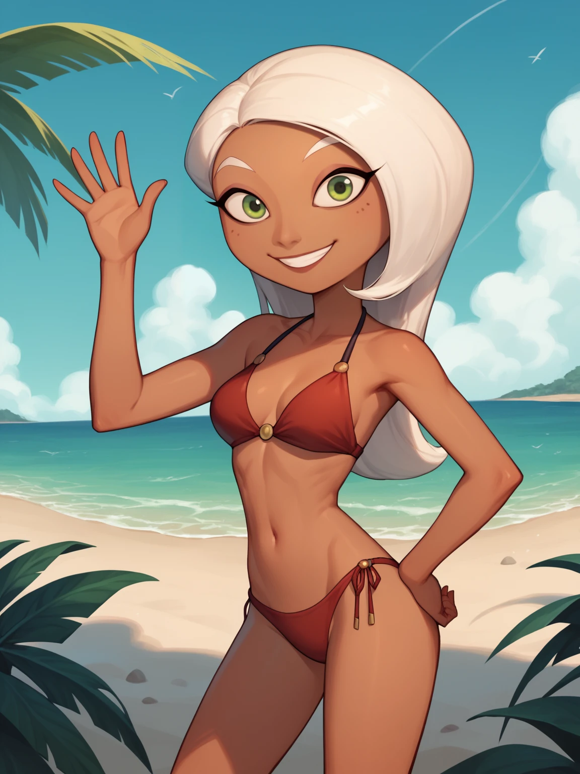 Basic prompts : 1girl, mirage, white hair, long hair, green eyes, dark skin