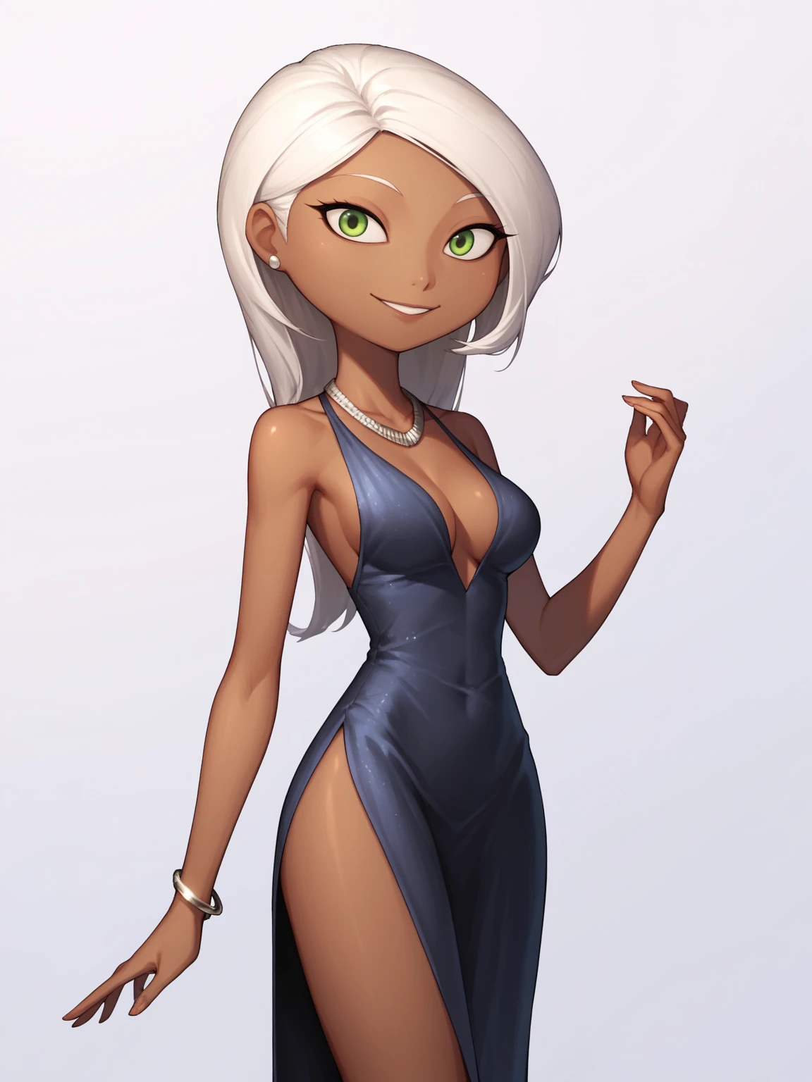 1girl, mirage, white hair, long hair, green eyes, dark skin
