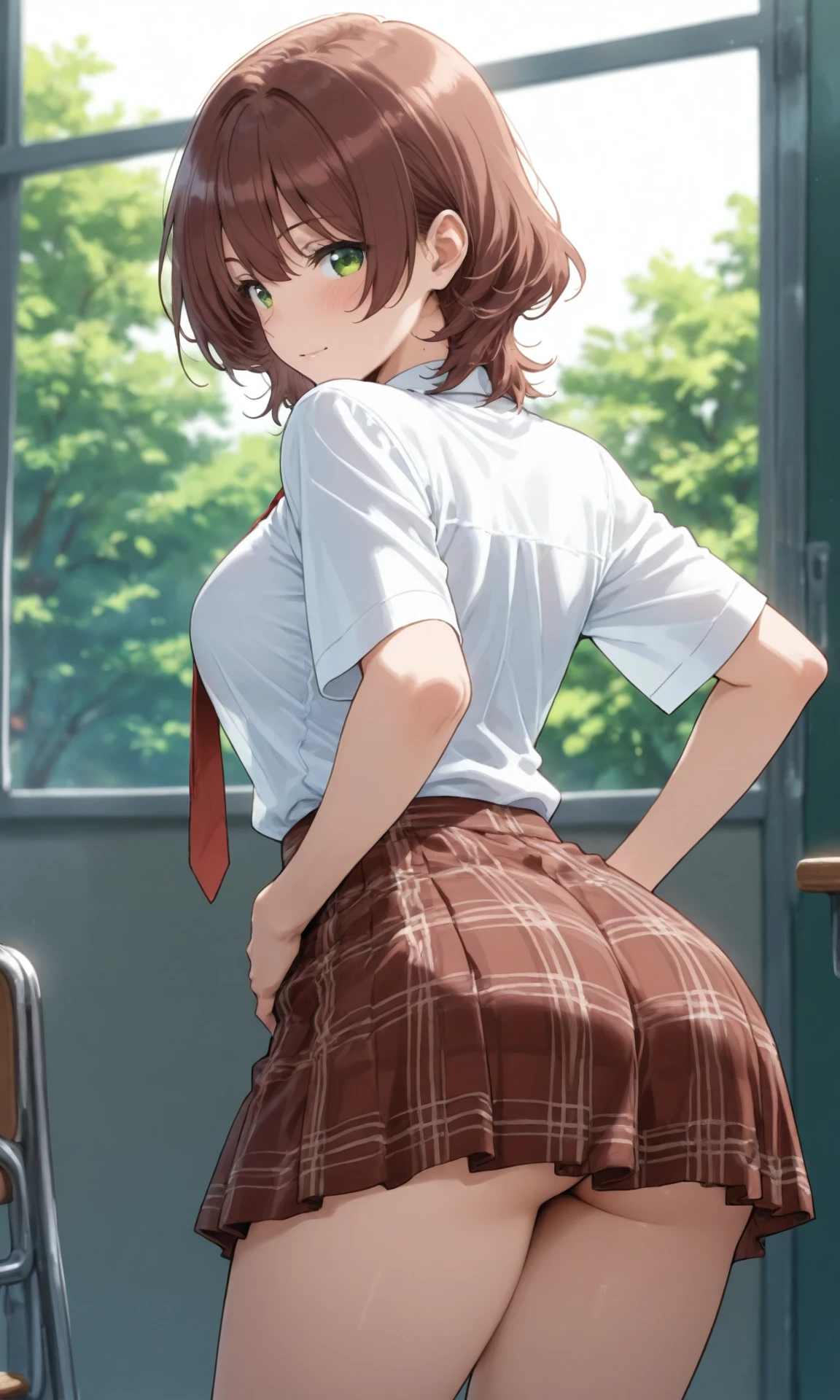 aoi hinami, green eyes, short hair, school uniform, white shirt, red necktie, plaid brown skirt