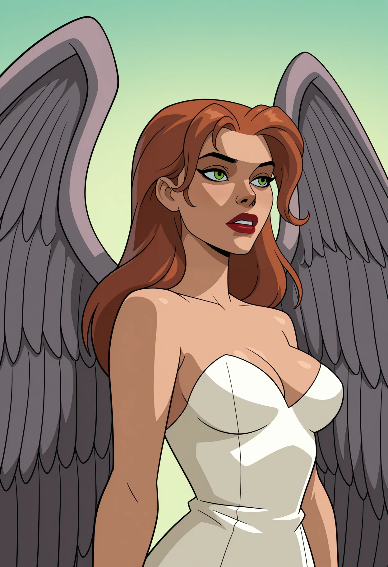 1girl, solo, green eyes, orange hair, red hair, brown hair, long hair, breasts, large breasts, wings, feathered wings, angel wings, lipstick, red lips,