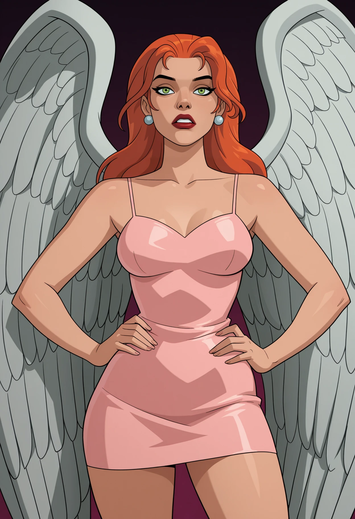 1girl, solo, green eyes, orange hair, red hair, brown hair, long hair, breasts, large breasts, wings, feathered wings, angel wings, lipstick, red lips,main outfit tags:
