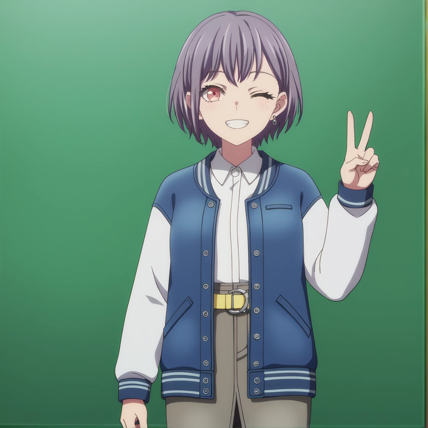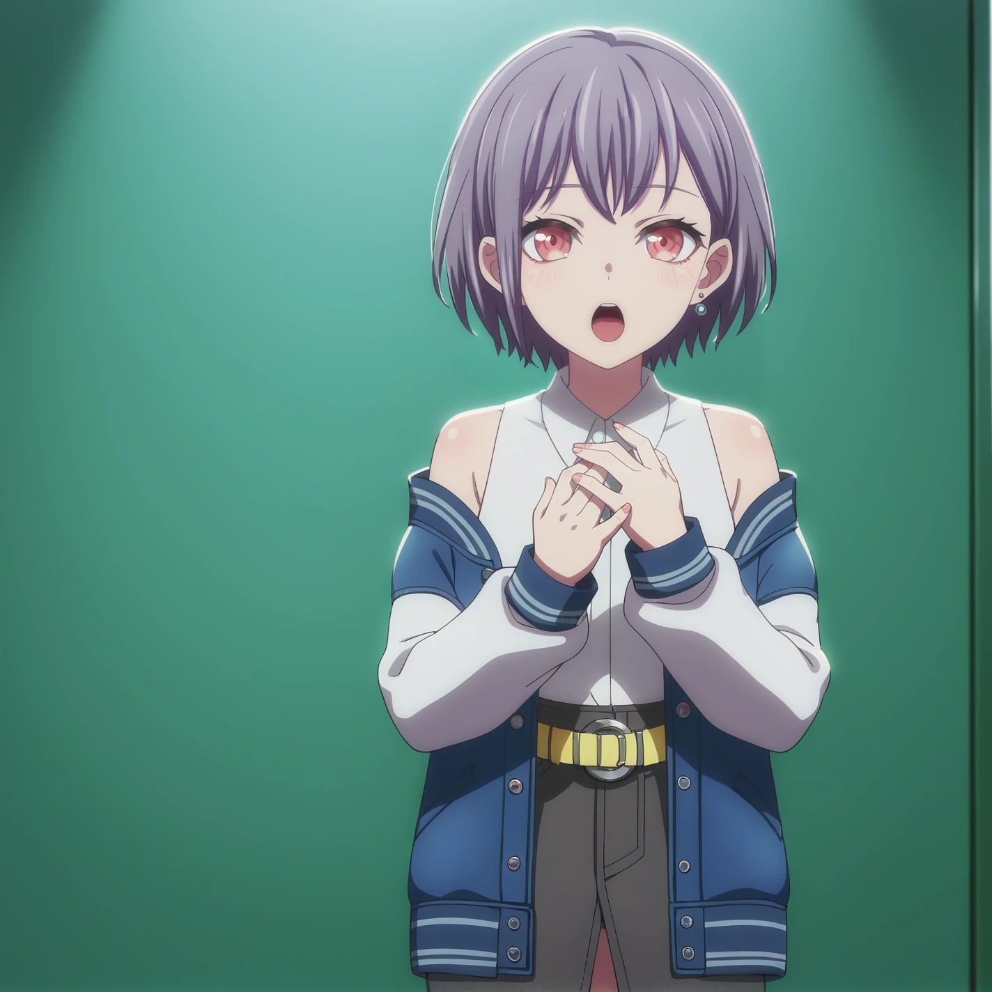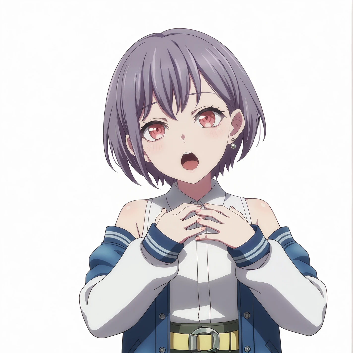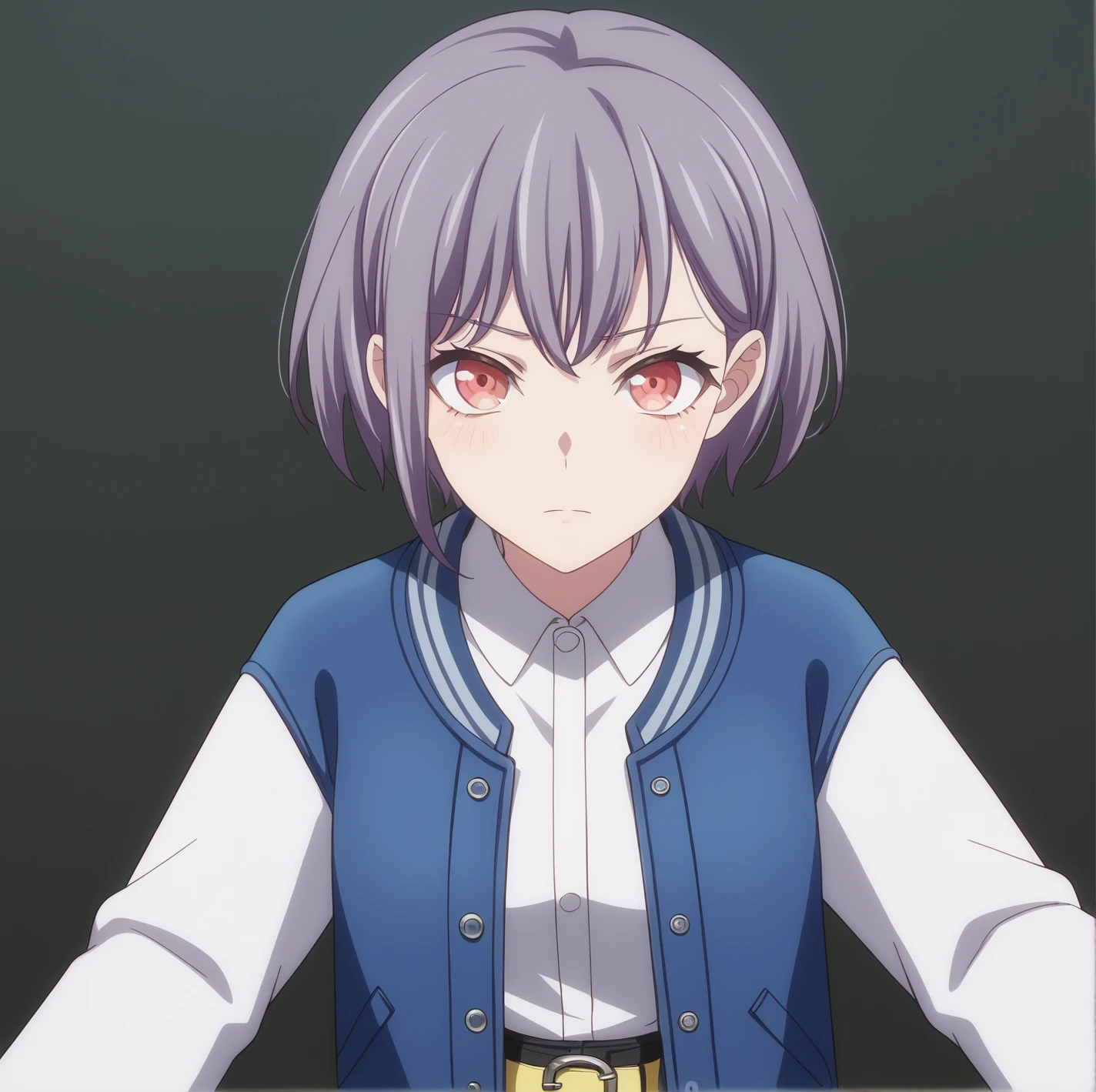Live Performance Outfit (if you want to draw off-shoulder, add “off shoulder,” “bare shoulders”): takamatsu tomori, short hair, grey hair, red eyes, bangclothes, blue jacket, white shirt, pencil skirt, collared shirt, open jacket, letterman jacket, long sleeves, belt