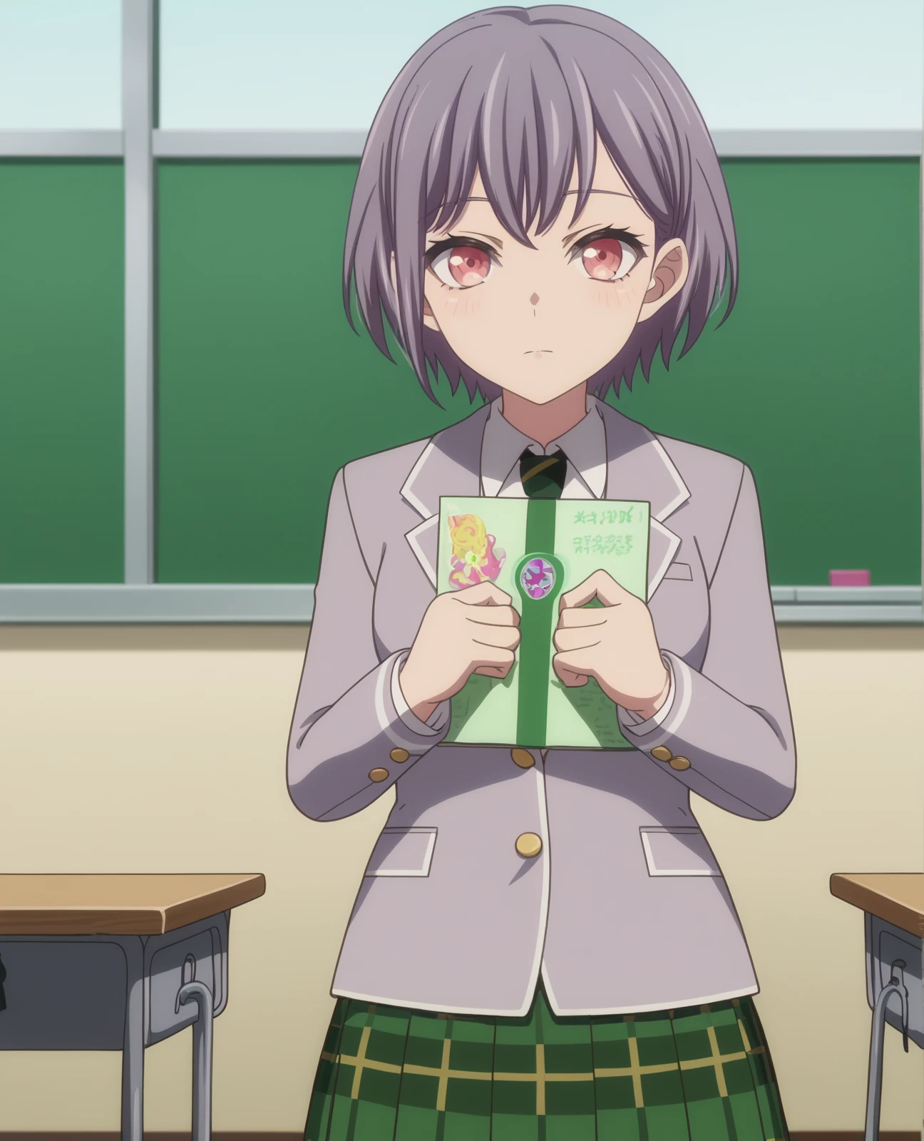 Winter School Uniform: takamatsu tomori, grey hair, short hair, red eyes, winter school uniform, green necktie, white shirt, grey jacket, green skirt, plaid skirt, pleated skirt