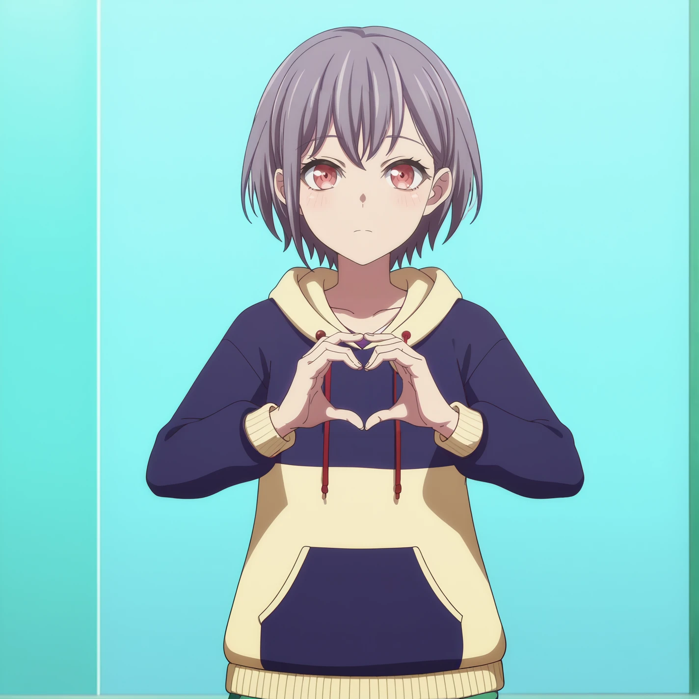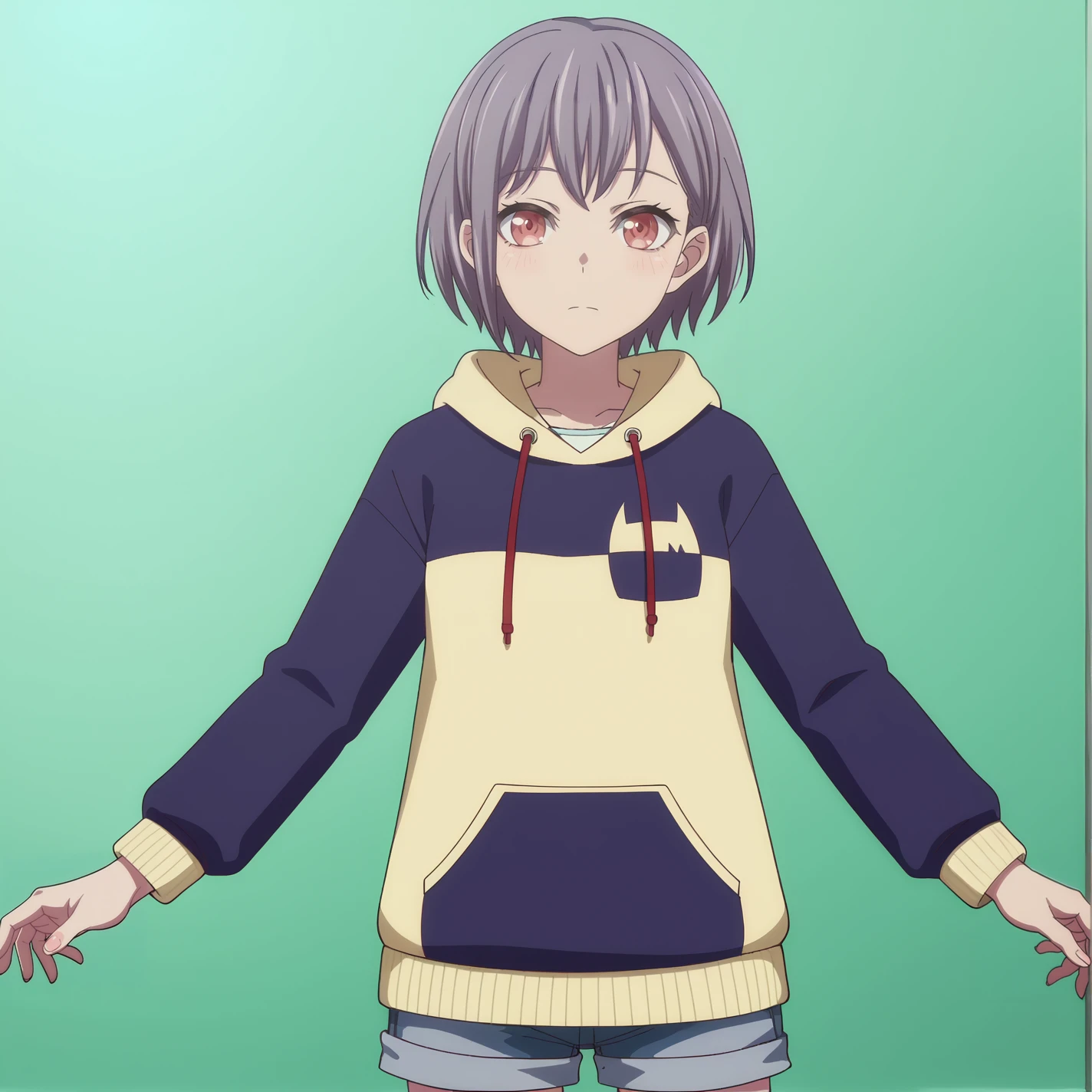 Casual Clothes: shorts, hood, hoodie, takamatsu tomori, short hair, grey hair, red eyes, tomori casual wear, long sleeves