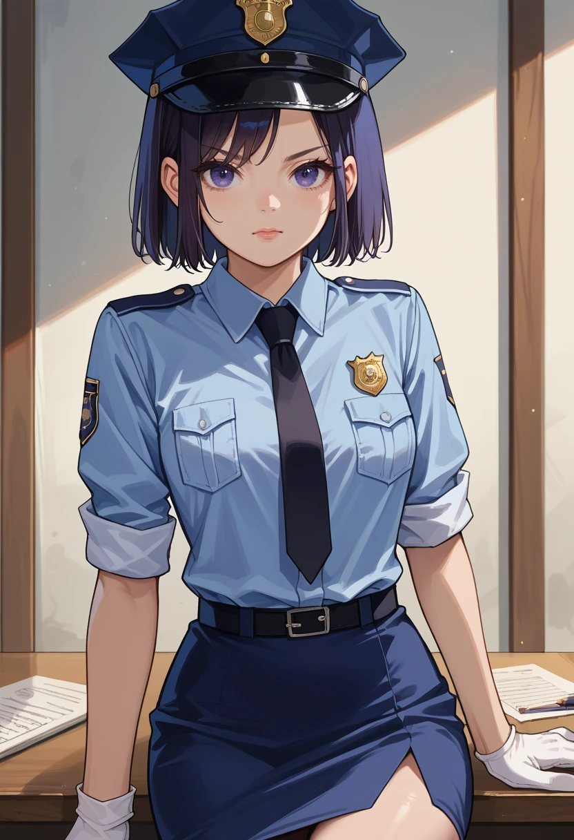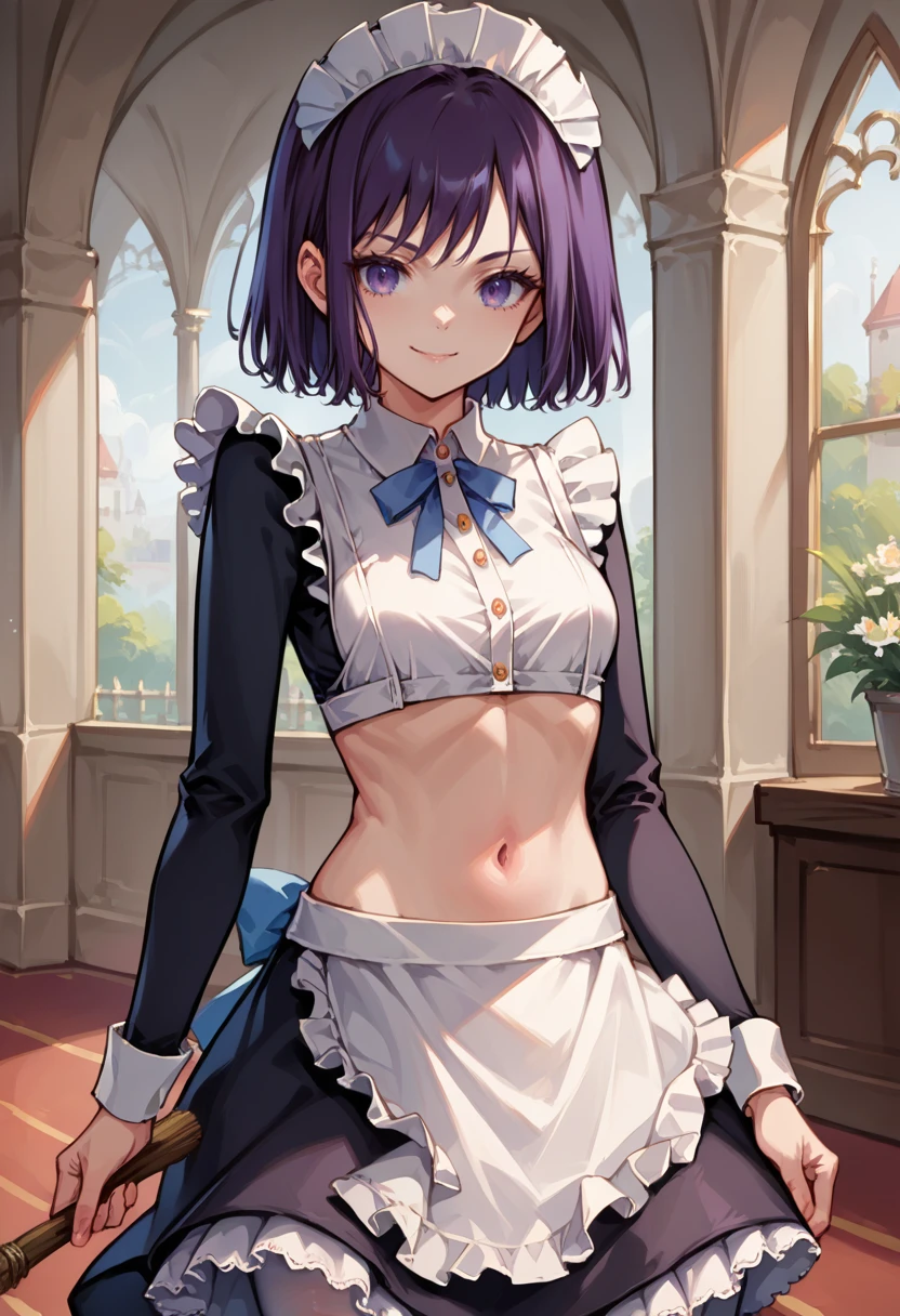 Sarah-san, short hair, maid headdress, maid, frills, crop top, blue neck ribbon, long sleeves, midriff, black skirt, waist apron, white pantyhoseLet me know if you have any issues.