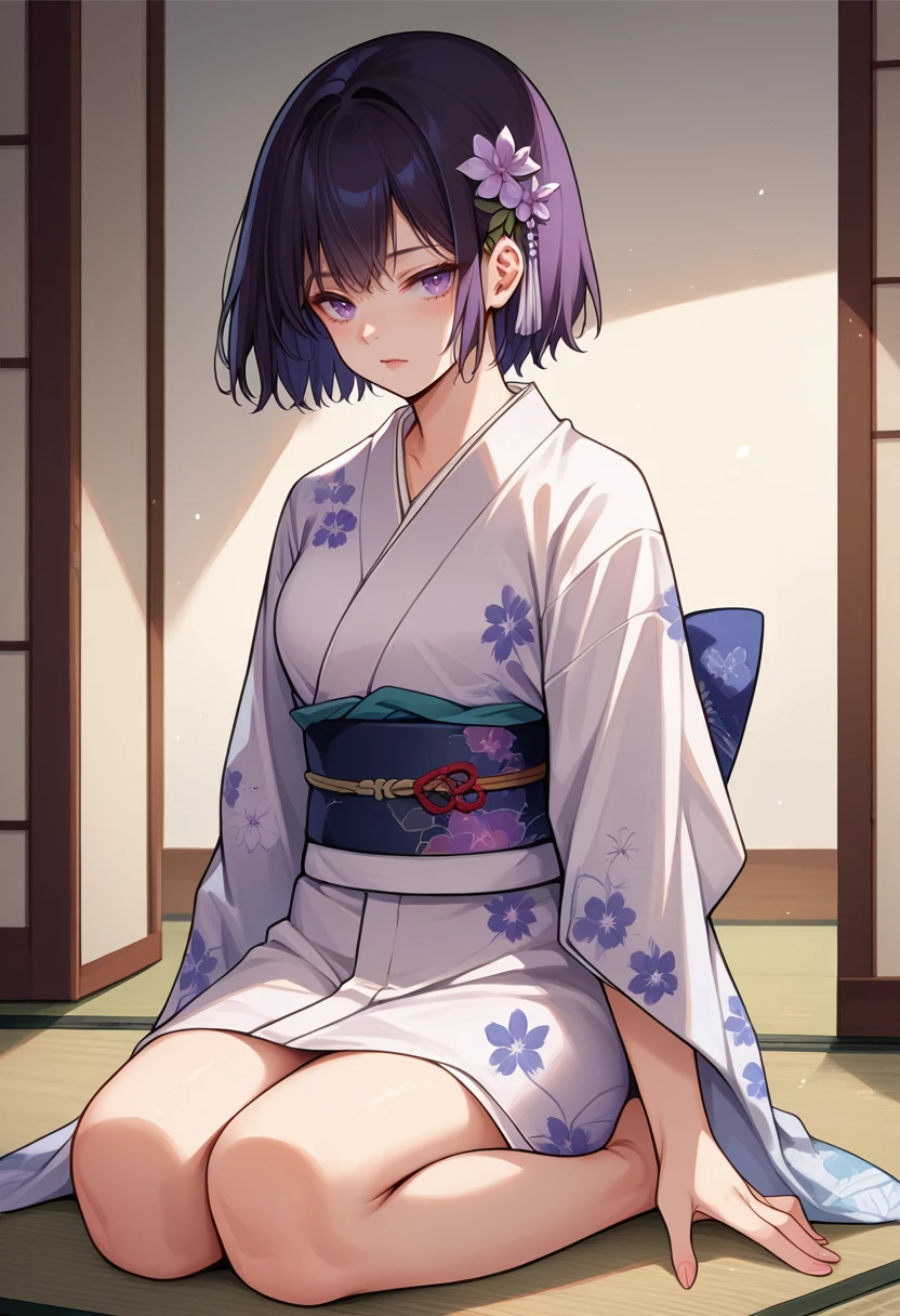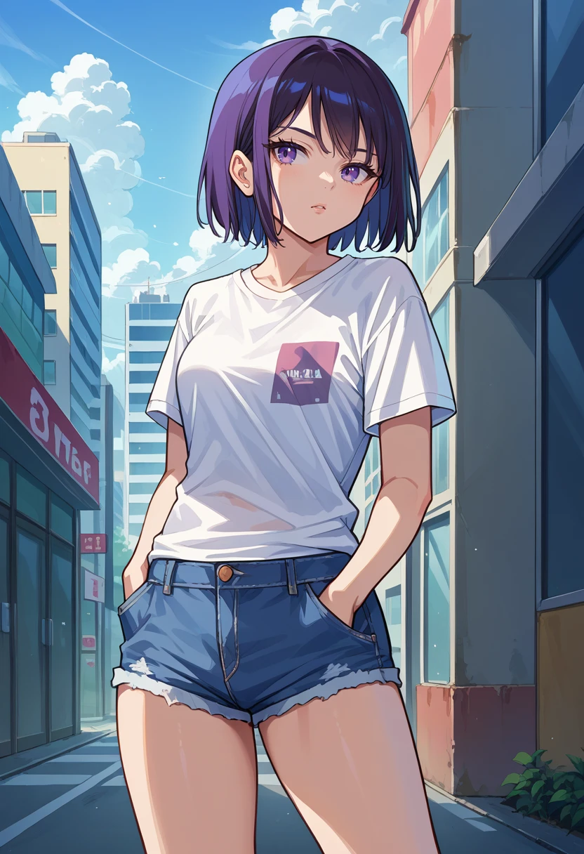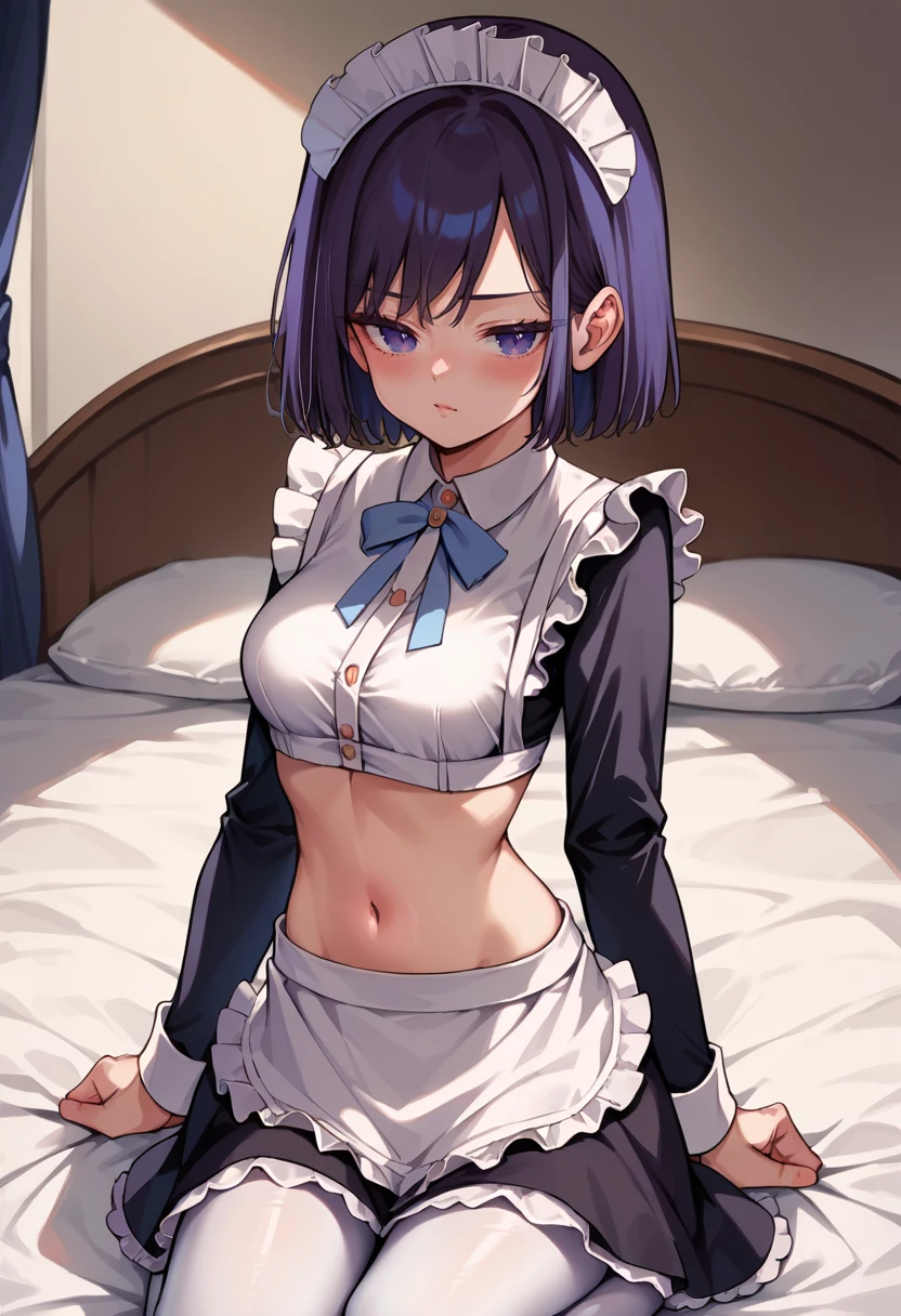 Sarah-san, short hair, maid headdress, maid, frills, crop top, blue neck ribbon, long sleeves, midriff, black skirt, waist apron, white pantyhose
